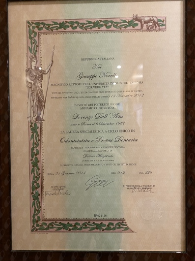2012 Abilitazione alla professione di Odontoiatra presso l’Università di Roma “Tor Vergata” con voto 60/60 in data 20/11/2012.