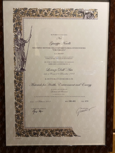 2017 Dottore di Ricerca in “Materials for Health, Environment and Energy” presso la facoltà di Medicina e Chirurgia dell’Università di Roma “Tor Vergata” con voto Eccellente in data 14/04/2017 con tesi di Dottorato Sperimentale sui Sistemi di detersione in Endodonzia