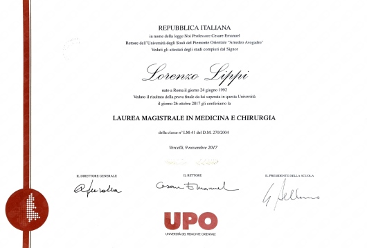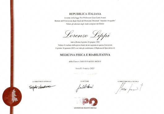 Il Dott. Lippi Lorenzo è un medico chirurgo, specializzato in Medicina Fisica e Riabilitazione con Lode. Indirizzo Riabilitazione Ortopedica e Riabilitazione del Dolore Muscolo-Scheletrico. Ha particolare esperienza nel campo della terapia infiltrativa, ossigeno-ozonoterapia, terapia del dolore, riabilitazione oncologica, ecografia muscoloscheletrica, riabilitazione dello sportivo, manipolazioni vertebrali, e management dell’osteoporosi. Ad oggi ricopre il ruolo di professore ac presso l'Università Svizzera L.U.de.S a Lugano, cultore della materia presso l'Università del Piemonte Orientale, consigliere regionale per la Società Italiana di Riabilitazione Neurologica (SIRN), e medico sociale per il F.C. Pro Vercelli 1892 S.R.L nella Serie C. Ha pubblicato più di un centinaio di articoli in riviste scientifiche di prestigio internazionale, guadagnando un posto nel Comitato Editoriale delle riviste internazionali "Frontiers in Neurology – Neurorehabilitation" e nel Comitato Editoriale di "BMC Sports Science, Medicine and Rehabilitation" e "BMC Geriatrics". Dal 2025 ricopre la cattedra di Professore Universitario in Medicina Fisica e Riabilitativa presso l’Università del Piemonte Orientale, rappresentando il più giovane accademico italiano ad aver conseguito tale traguardo nell'ambito della riabilitazione.