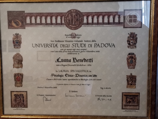 Mi sono laureata all'Università di Padova e specializzata in Psicoterapia Interattivo-Cognitiva a Mestre. Ho conseguito il Master universitario in Contemplative Studies presso l'Università di Padova, approfondendo le pratiche contemplative buddhiste e i programmi meditativi moderni per la riduzione dello stress, l'equilibrio emotivo e lo sviluppo personale.