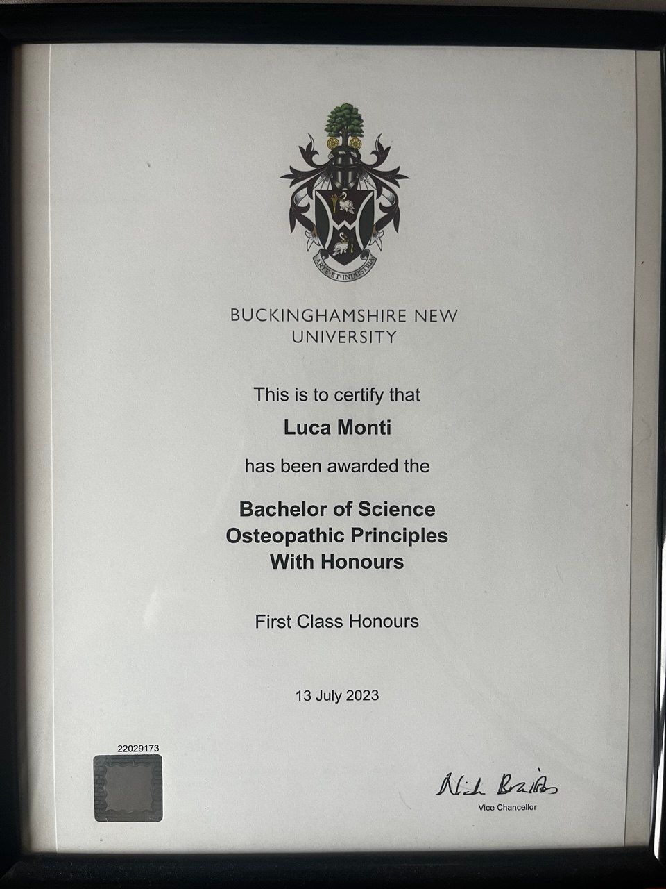 Osteopata laureato presso l’Istituto Superiore di Osteopatia (ISO) di Milano, dove ha conseguito il Diploma di Osteopatia (D.O.) e la laurea magistrale (M.Sc.) in collaborazione con la Buckinghamshire New University di Londra, Membro ROI 9238.