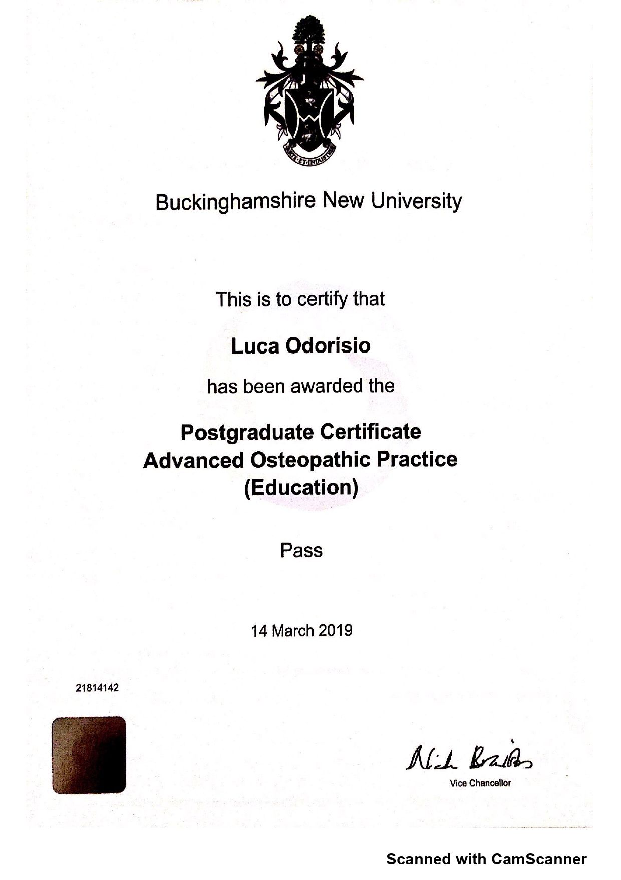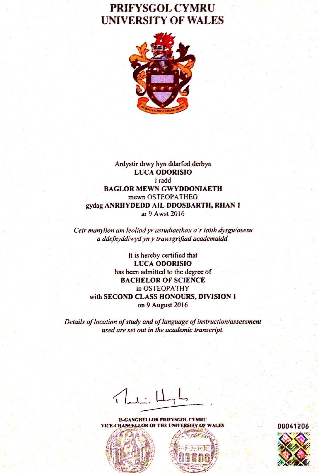 Nel 2016 ho ottenuto il Bachelor of Science in Osteopathy (BSc Hons) tramite la University of Wales (UK).