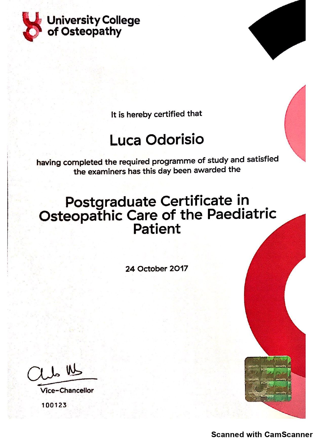 Nel 2017 mi sono specializzato in Osteopatia Pediatrica con il Postgraduate Certificate Osteopathic Care of the Paediatric Patient presso la University College of Osteopathy (UCO) di Londra.