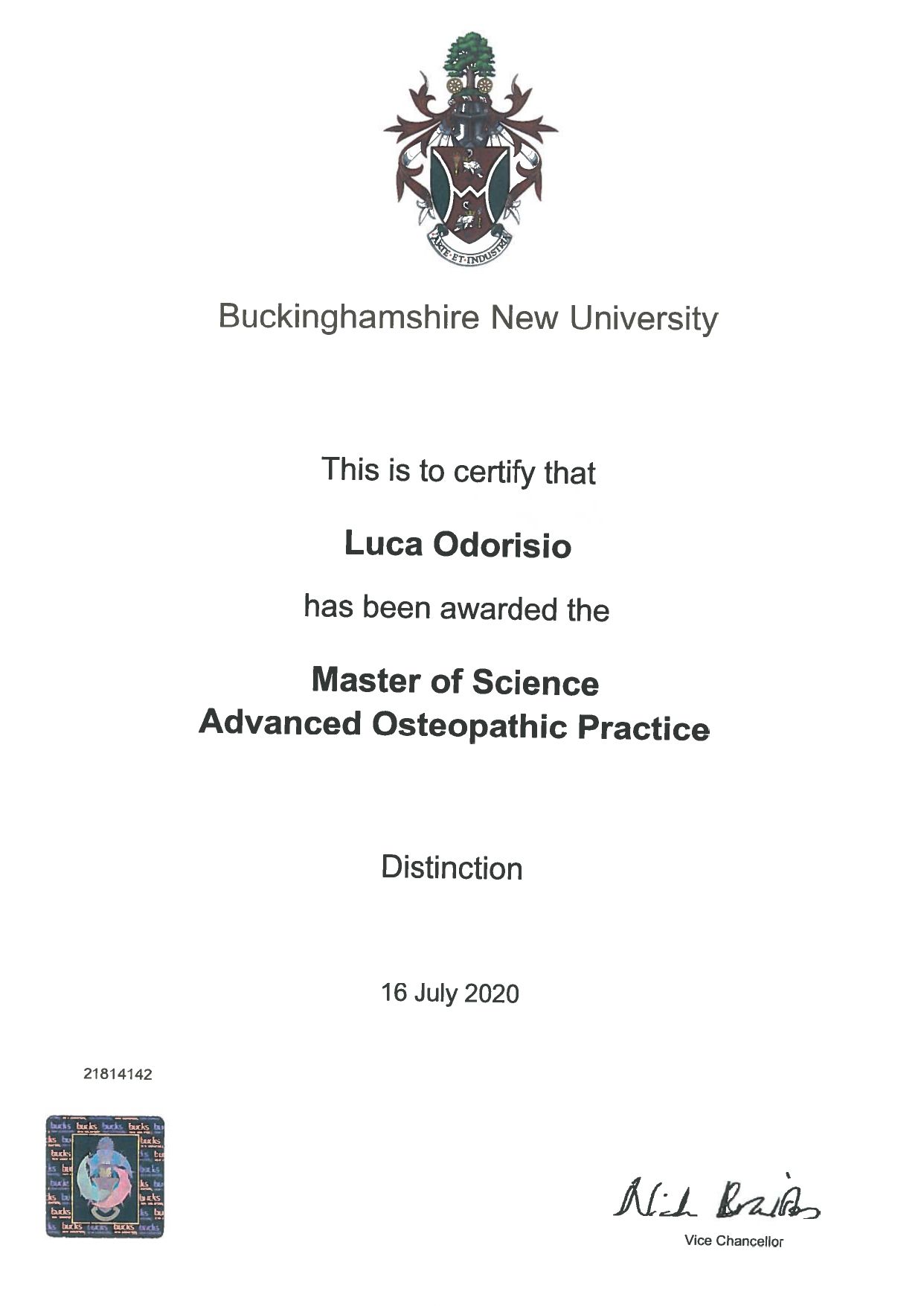 Ho completato il mio percorso accademico con un Master of Science (MSc) in Advanced Osteopathic Practice nel 2020, titolo conferito dalla Buckinghamshire New University (UK).