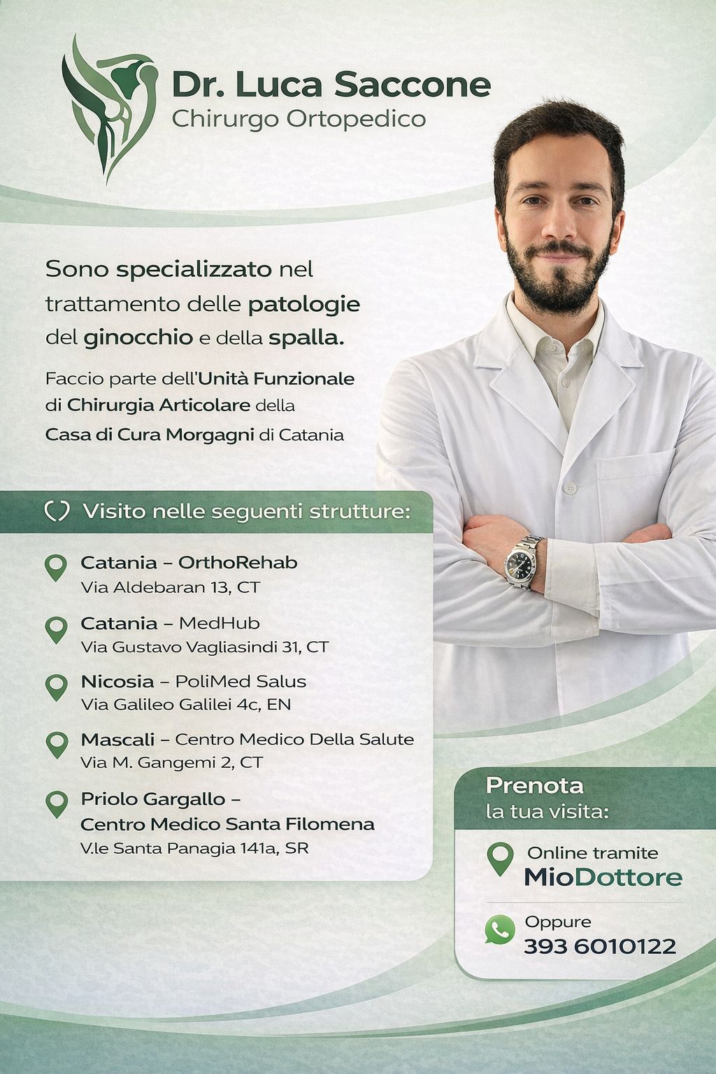 Dal 2026 faccio parte dell’équipe chirurgica del Dott. Angelo Di Giunta presso l’Unità Funzionale di Chirurgia Articolare della Casa di Cura Morgagni di Catania.