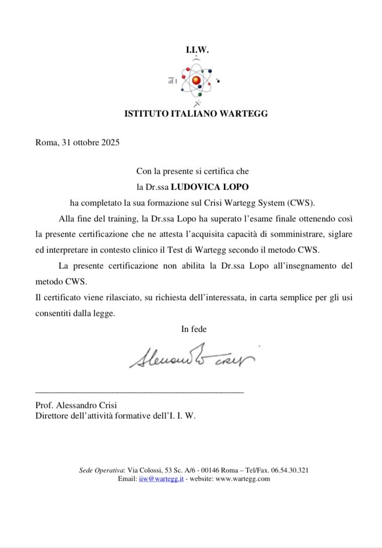 Nel 2025 ho conseguito il certificato di Psicodiagnosta esperto nella somministrazione del test di Wartegg presso l’Istituto Italiano Wartegg di Roma.