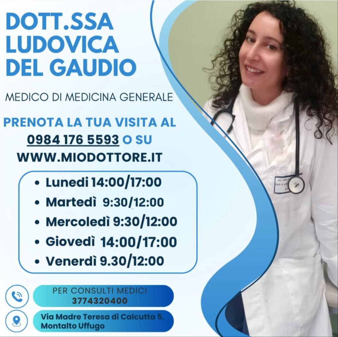 Studio Di Medicina Generale Associato. Si riceve su appuntamento da prendere telefonicamente o tramite piattaforma web, sono sempre garantite le urgenze mediche chiamando al numero 09841765593.