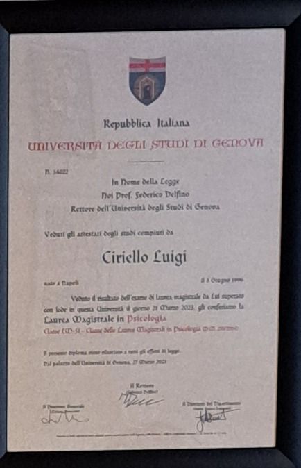 Mi chiamo Luigi Ciriello, sono uno psicologo iscritto all'albo della Liguria. Sono laureato in psicologia dello sviluppo. Ho esperienza con adolescenti e adulti, a cui mi rivolgo tuttora nella pratica libero professionale.