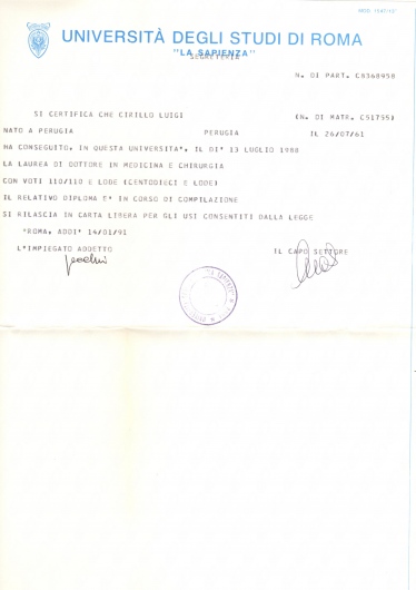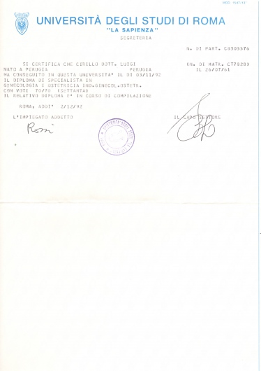 Since 26/11/1989 to December 2011 he has worked as self-employed physician for the Clinic Villa Pia as assistant to the head of the Gynaecology and Obstetrics Department. Since Genuary 2012 to October 2015 he has worked as self-employed physician for the Clinic Santa Famiglia as assistant to the head of the Gynaecology and Obstetrics Department.