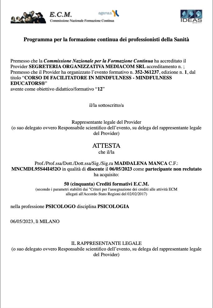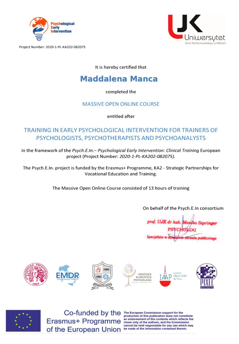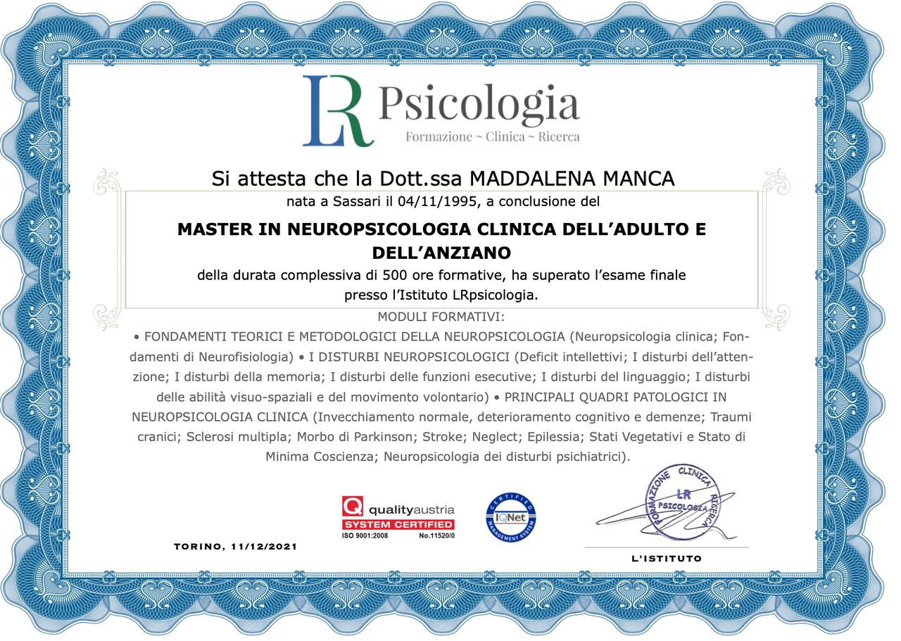 Spinta da un forte interesse per l’ambito neuropsicologico, ho approfondito le mie competenze attraverso un master in Neuropsicologia Clinica dell’Adulto e dell’Anziano, che mi ha formato nell’ambito della valutazione e della riabilitazione neuropsicologica.