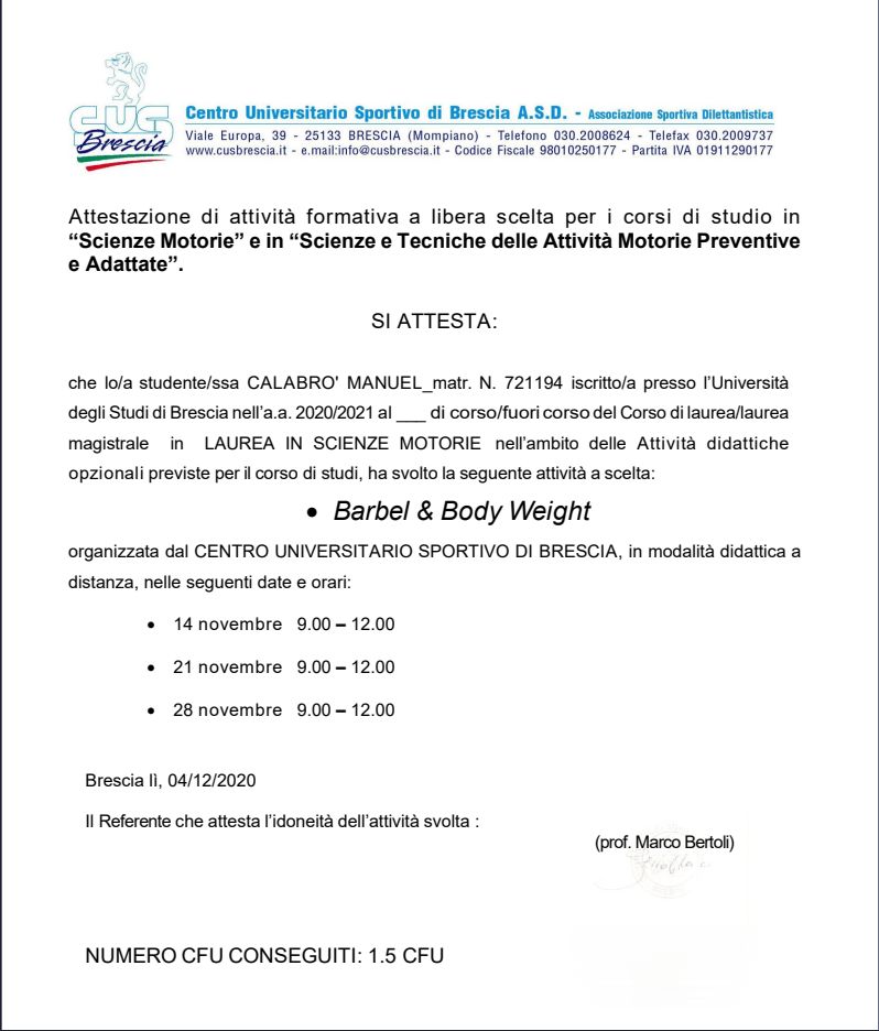 Sono Manuel Calabrò, Chinesiologo operante nella zona di Bergamo, in sede, a domicilio e online. Mi sono laureato in Scienze Motorie e Sportive all'università degli studi di Brescia, voto 101. In seguito ho iniziato a lavorare per la Gymnasium Wellness SPA, dove ho svolto per tre anni il ruolo, occupandomi di consulti chinesiologici, valutazioni posturali ed erogazione di sedute di personal training Chinesiologico. Mi occupo di attività motoria adattata per persone con problematiche o dolori tipici della vita comune, come cervicalgie, lombalgie, sciatalgie... del recupero fisico dopo infortuni o infiammazioni. Per un consulto introduttivo iniziale non esitate a inviarmi un whatsapp al +39 3406740208
