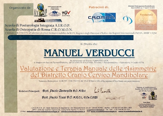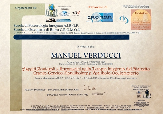 Dal 9 al 12 febbraio 2012: Scuola di posturologia integrata A.I.R.O.P.; scuola di osteopatia di Roma C.R.O.M.O.N. - Aspetti posturali e duramerici nella terapia integrata del distretto cranio-cervico-mandibolare e vestibolo-oculomotorio.