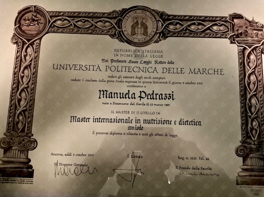 Decido quindi di approfondire le mie conoscenze iscrivendomi al Master di II livello in Nutrizione e Dietetica presso l’Università di Ancona, ottenendo il titolo nel 2015 con 110 lode.