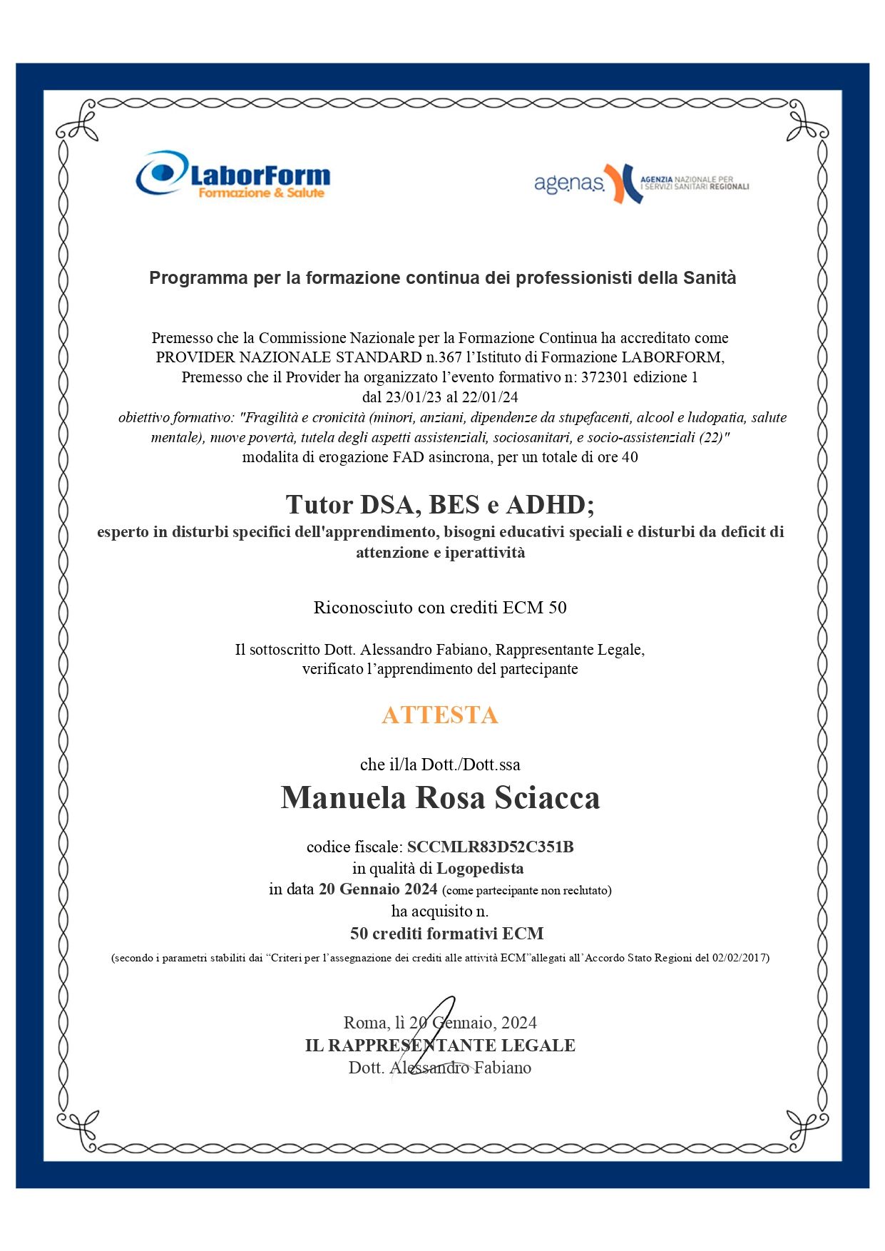 Mi chiamo Manuela , sono una logopedista magistrale con venti anni di esperienza , mi occupo di terapia logopedia in età evolutiva ed adulta, nel corso degli anni mi sono formata con corsi specializzanti su più patologie , adhd ,deficit cognitivi, disturbi dell'apprendimento , disturbi di voce , disturbi di linguaggio primari e secondari; costruisco piani di trattamento personalizzati rispettando le caratteristiche di ognuno, se sei mamma o papà e stai cercando qualcuno che segua tuo figlio con pazienza , costanza e cuore , sarò felice di mettere la mia esperienza al tuo servizio.