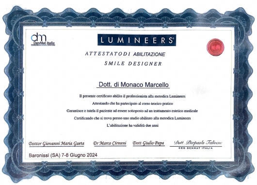 Sono abilitato all'utilizzo delle faccette Lumineers e detengo l'attestazione di centro d'eccellenza in questo campo.