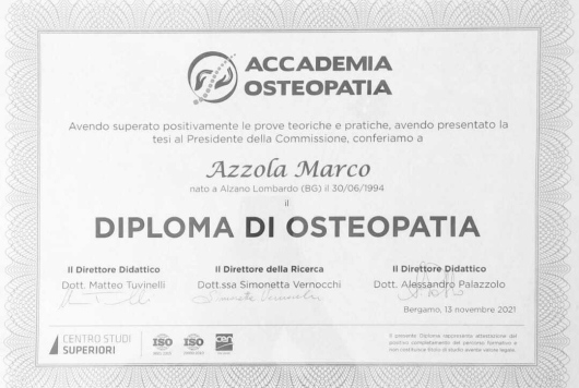 Mi sono diplomato presso Accademia Osteopatia Milano nel 2020 dopo di che ho lavorato in diverse strutture e ho seguito molte squadre sportive, le esperienze più formative sono state sicuramente seguire le atlete della Volley Bergamo e gli atleti dell’Albinoleffe.