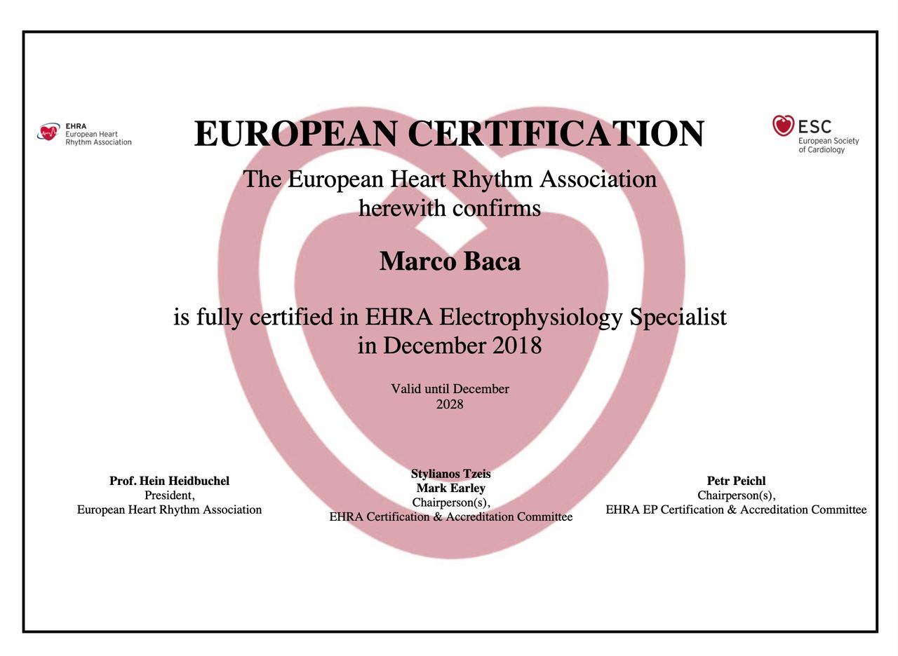 Ho ottenuto le certificazioni della European Heart Rhythm Association in elettrofisiologia cardiaca (2018) ed elettrostimolazione (2019).