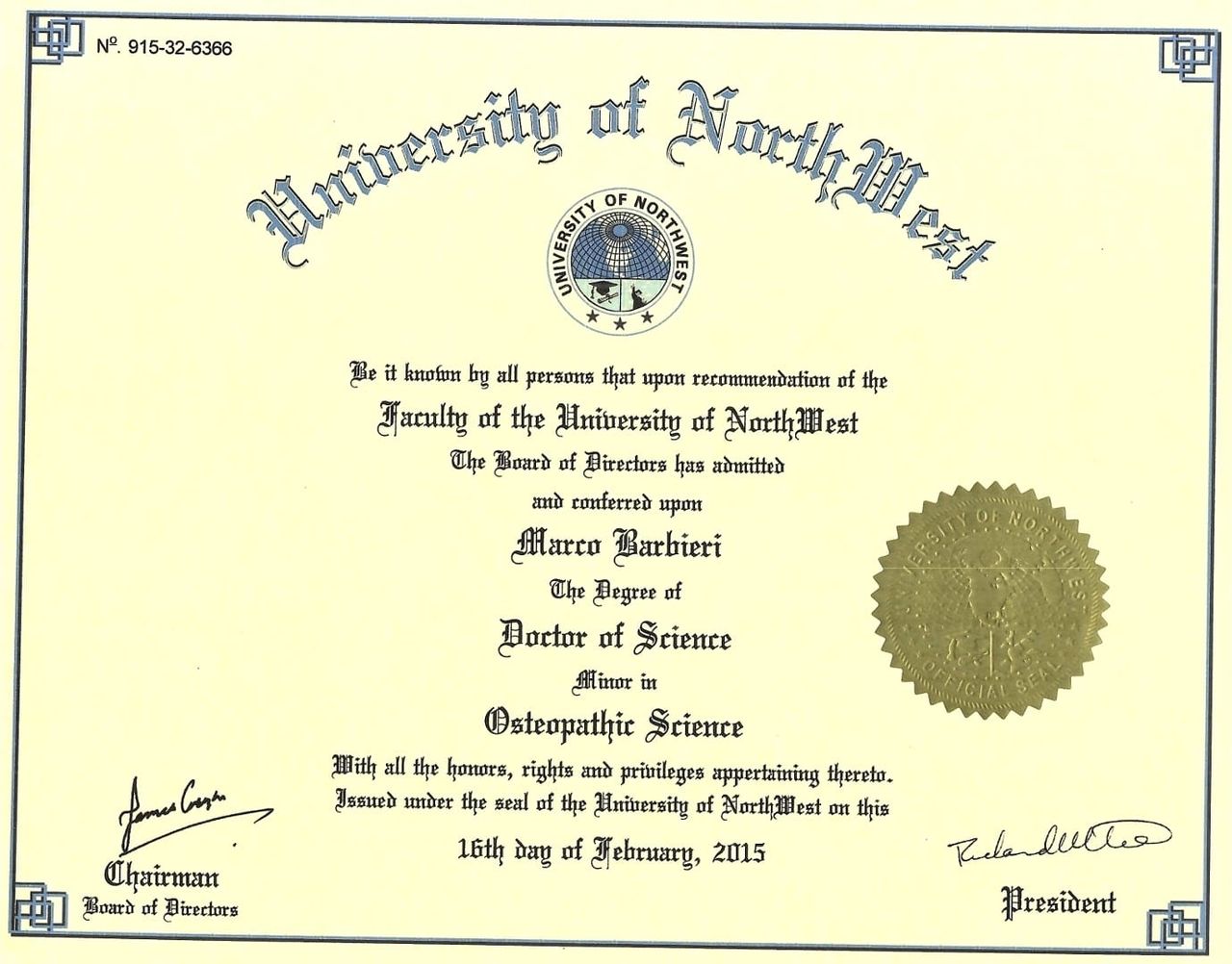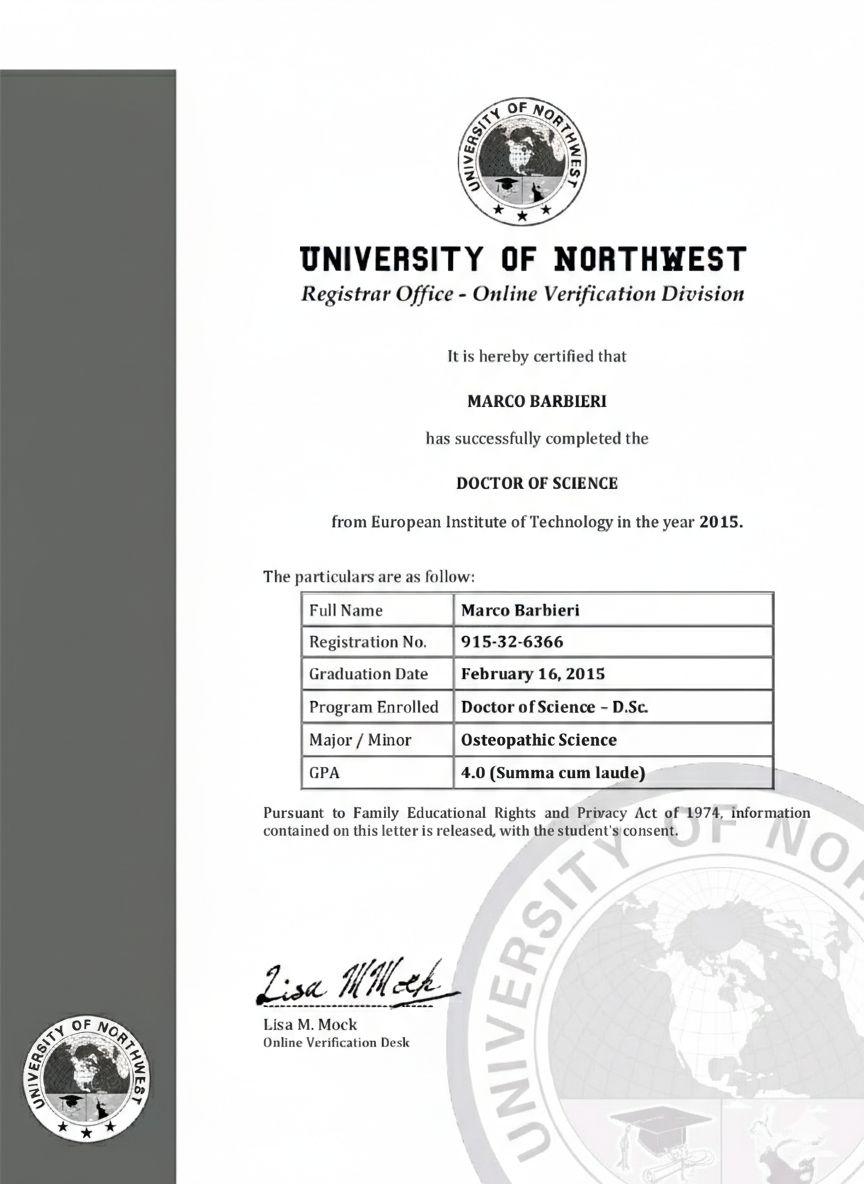 Nel 2015 conseguo la laurea in Osteopatia presso L'University of NorthWest a Seattle nello stato di Washington. Successivamente conseguo un master in Osteopatia classica ed ho l'onore e il privilegio di collaborare con il mio mentore , docente e amico per sempre Fú Dott. Ezio Rittà. Il miglior Osteopata che abbia mai conosciuto.