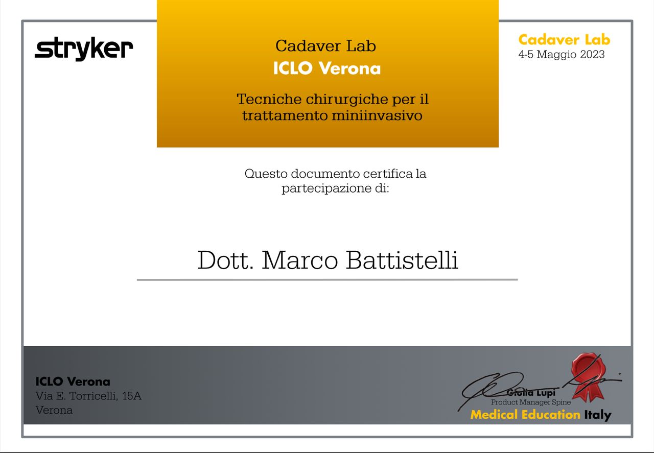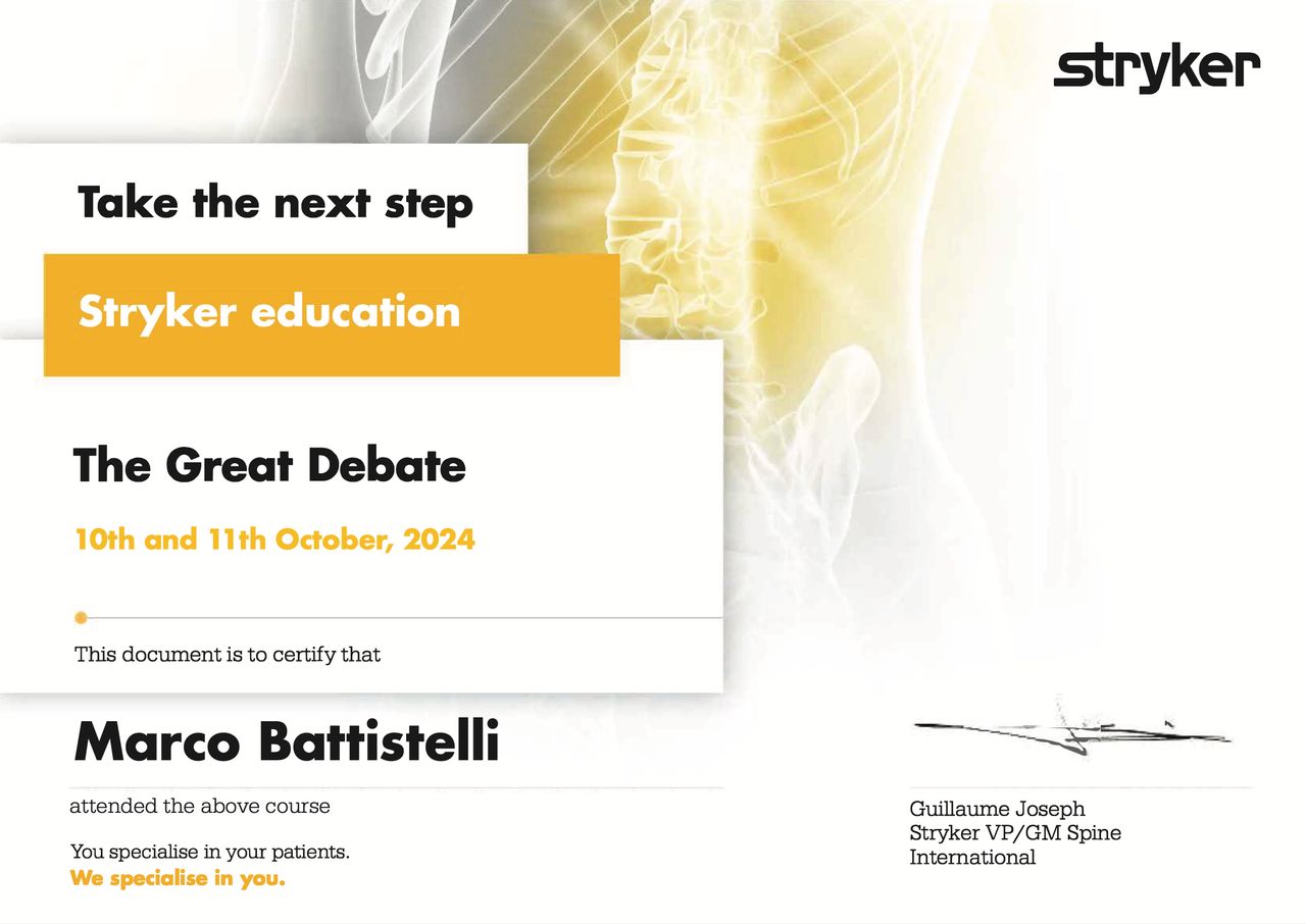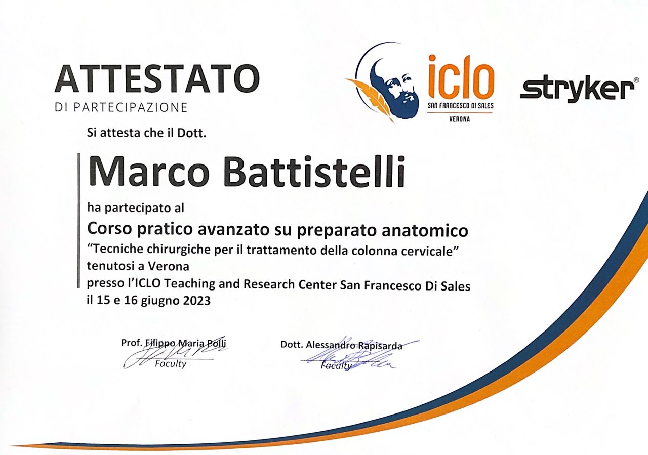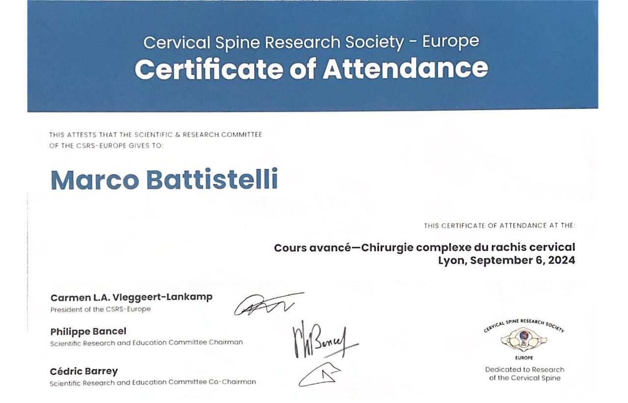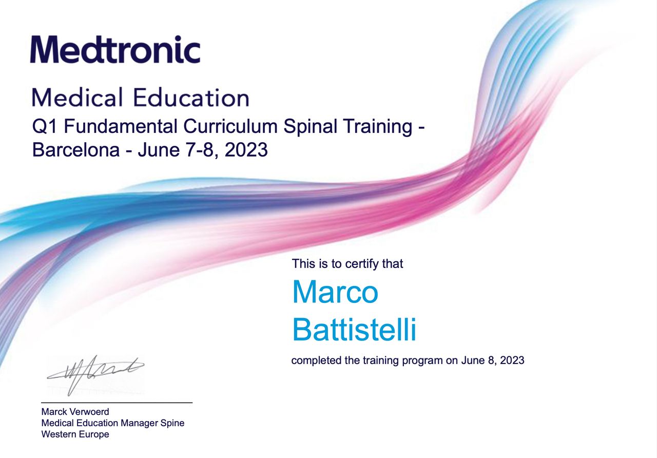Dopo la laurea in medicina con lode, mi sono specializzato in Neurochirurgia con lode presso il Policlinico Agostino Gemelli. Ho svolto la mia formazione presso centri di riferimento per la patologia vertebrale e del midollo spinale, come l'unità spinale dell'ospedale Careggi di Firenze, e l’Ospedale Kremlin-Bicêtre di Parigi, centro di riferimento nazionale per le patologie del midollo spinale.