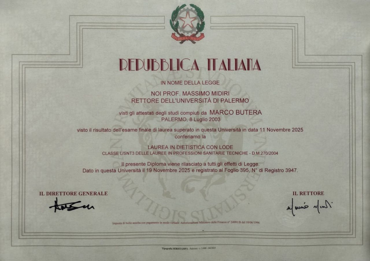 Benvenuto/a sul mio profilo. Sono il dott. Marco Butera, dietista, e credo che il cibo debba essere un alleato, non un nemico da combattere. Il mio approccio alla nutrizione è diretto e pratico: niente schemi punitivi o rinunce insostenibili, ma un percorso costruito su misura per farti ritrovare l'energia e farti stare bene con il tuo corpo.