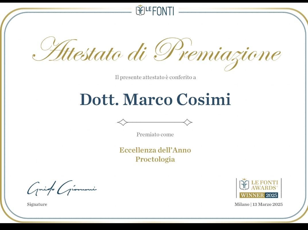 il Dottor Marco Cosimi si laurea in Medicina e Chirurgia presso l'Università degli studi di Roma La Sapienza, in maniera eccellente. Successivamente, accetta la proposta di addetto alla ricerca e sviluppo, con un contratto per il gruppo Janseen Beers, consociato della Johnson&Johnson. Qualche tempo dopo, consegue, dapprima il Diploma di Specializzazione in Chirurgia Generale presso l'Università di Roma 'La Sapienza' e poi, il Diploma di Specializzazione in Chirurgia Vascolare presso il Policlinico Universitario A. Gemelli di Roma. Acquisisce, subito dopo, esperienza in Chirurgia d'Urgenza presso l'Ospedale S. Eugenio di Roma e, infine, consegue il Diploma di Specializzazione in Urologia, presso l'Università degli studi di Roma Tor Vergata.