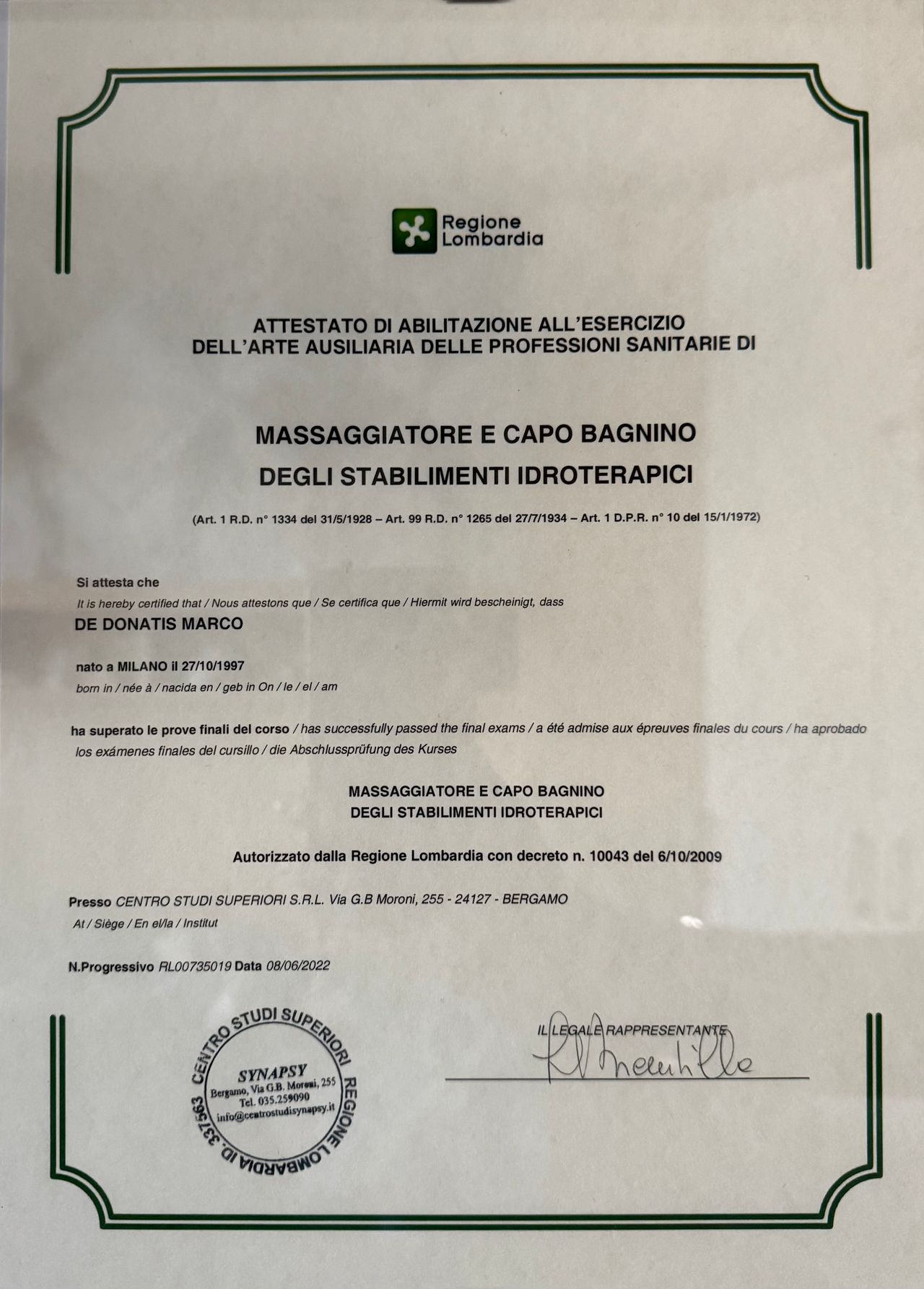 Ciao! Sono Marco De Donatis, massoterapista certificato. Ho iniziato il mio percorso al centro studi Synapsy di Bergamo, dove nel 2022 ho conseguito il diploma da massoterapista (MCB). Successivamente ho collaborato con vari poliambulatori sui territori di Milano e Monza, lavorando