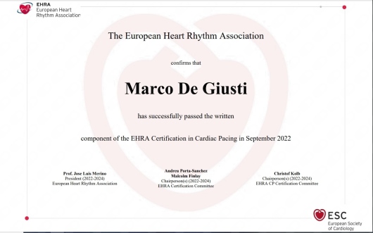 - Attestato di competenza in Elettrostimolazione Cardiaca della Società Europea di Aritmologia (EHRA) conseguito a Settembre 2022;