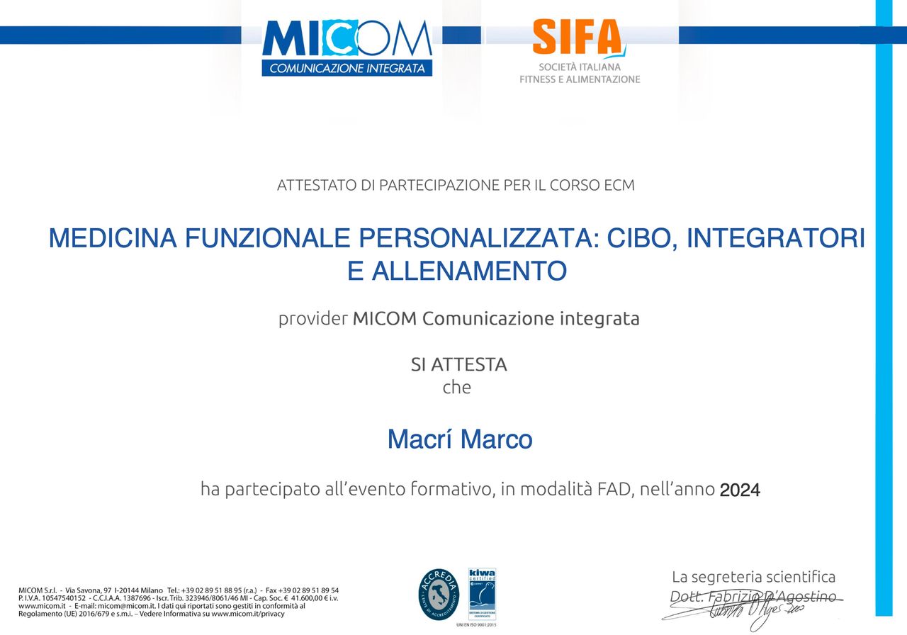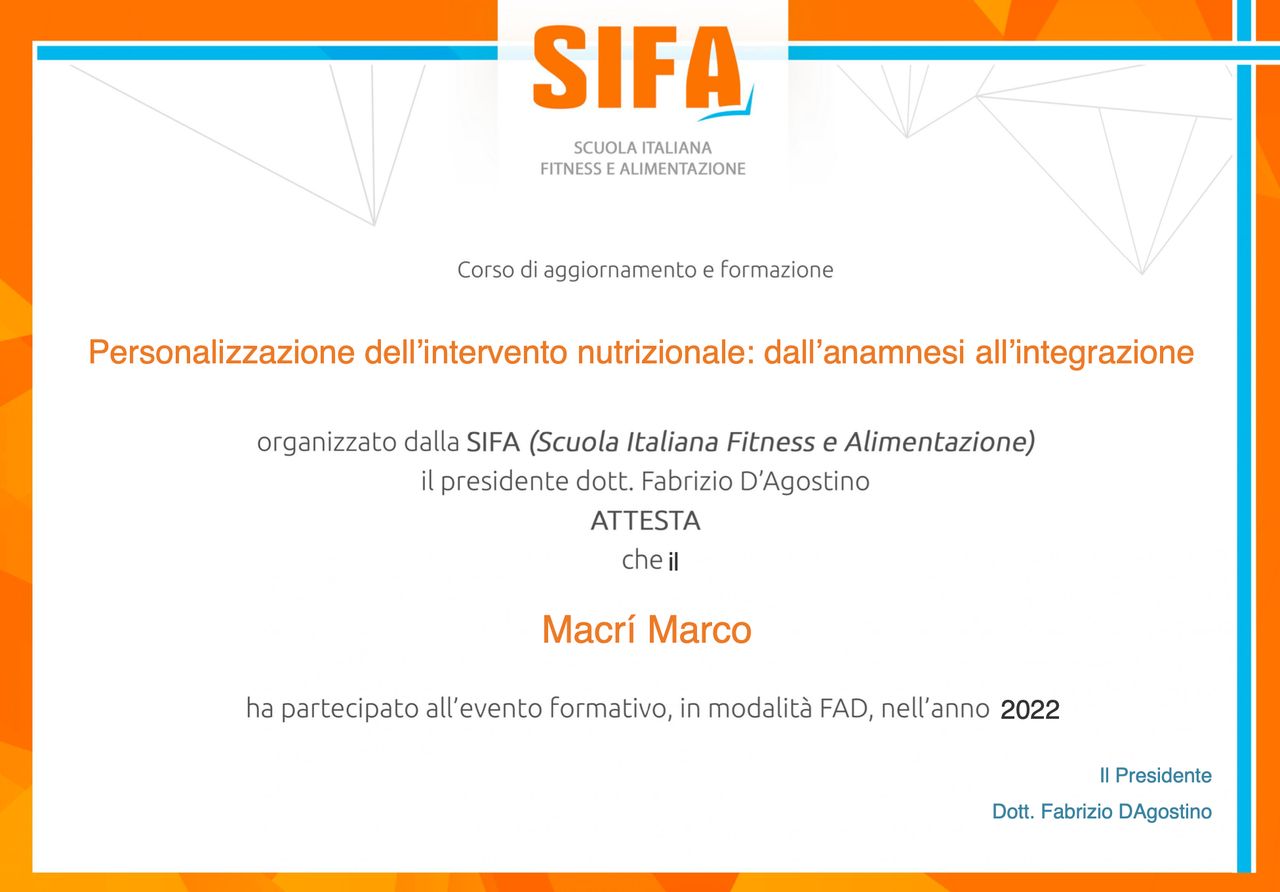 Ho intrapreso un percorso con il Dott. Macrì ormai da più di 2 mesi, a Gennaio. Ho già iniziato a raggiungere qualche soddisfazione e sono a buon punto nel mio percorso verso i miei obiettivi, grazie alla sua professionalità e competenza nel campo della dietetica. Mi sta aiutando a raggiungere i miei obiettivi di salute e forma fisica in modo efficace, grazie ad un piano alimentare personalizzato e molto flessibile. Inoltre, la sua disponibilità e attenzione alle mie esigenze mi fanno sentire sempre supportato e seguito nel percorso di miglioramento. Risponde in pochissimo tempo alle mie richieste e ai miei dubbi a qualsiasi ora della giornata. Sono davvero molto soddisfatto del fatto di essermi affidato alle sue cure e ai suoi consigli.