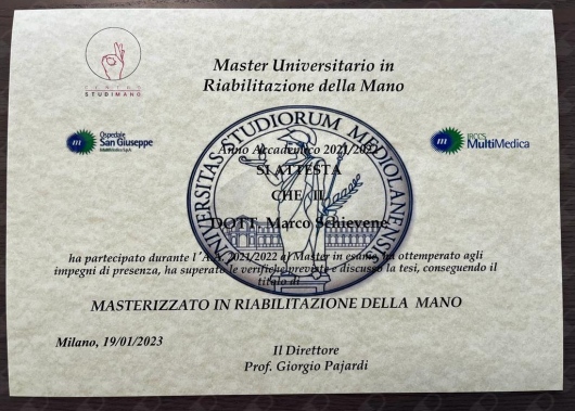 Nel 2022 ho conseguito il Master in Riabilitazione specialistica della Mano e dell'arto superiore presso L'Università degli Studi di Milano.