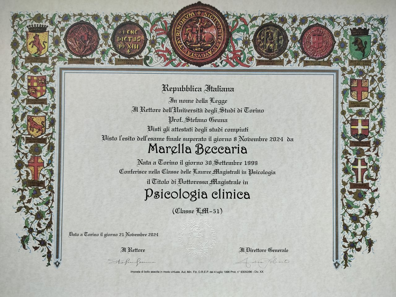 Ho studiato presso l'Università degli studi di Torino, mi sono laureata in psicologia clinica a novembre del 2024 portando a termine lo svolgimento di una tesi di ricerca presso il Day Hospital oncologico dell'ospedale San Giovanni Bosco di Torino; ho scelto di continuare nella medesima sede per compiere il tirocinio post lauream, che mi ha permesso di approfondire il tema della sofferenza emotiva e del distacco. Attualmente sono specializzanda presso l'Istituto di psicoterapia psicoanalitica IPP di Torino, svolgendo tirocinio in ambito evolutivo e gentioriale.