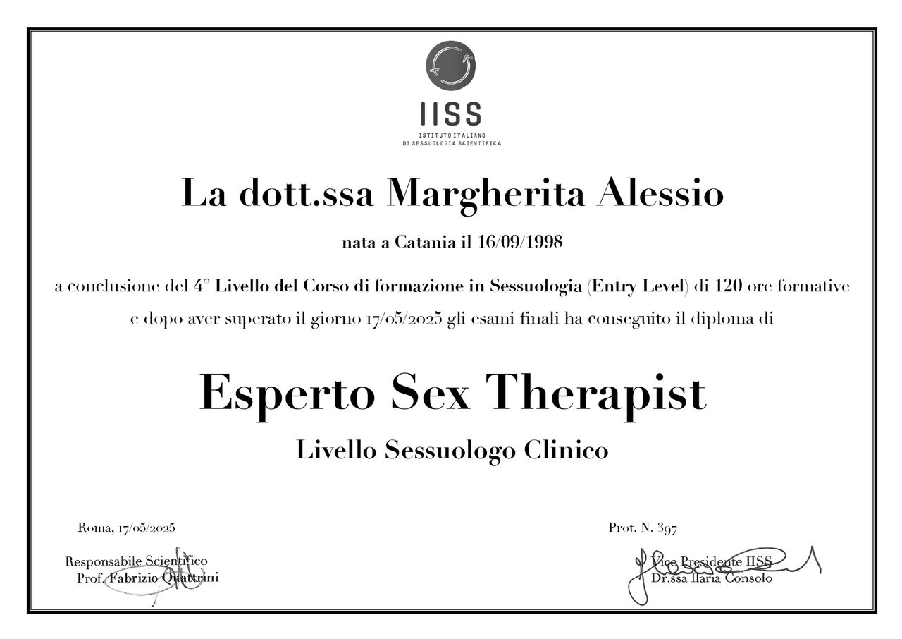 Sono Margherita Alessio, psicologa e sessuologa clinica. Ho conseguito la laurea in Psicologia Clinica presso la Sapienza Università di Roma e, dopo l'abilitazione alla professione di psicologa, ho acquisito il titolo di Sessuologa Clinica presso l'Istituto Italiano di Sessuologia Scientifica. Ho svolto il lavoro di operatrice all'interno dei Centri Antiviolenza, acquisendo competenze nell'ambito del supporto a vittime di violenza di genere. Attualmente lavoro come psico-sessuologa in libera professione.