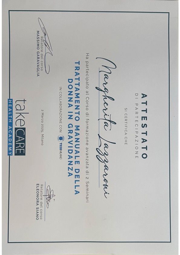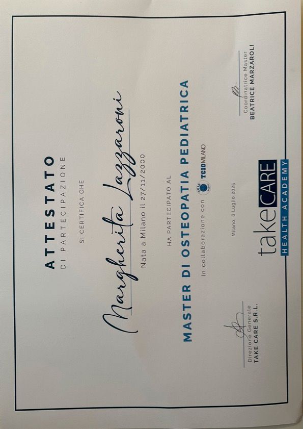 Grazie a questa formazione, mi occupo anche di osteopatia in gravidanza e post-partum, aiutando le donne a gestire dolori lombari, tensioni pelviche e disturbi digestivi legati ai cambiamenti del corpo, e di osteopatia pediatrica, con particolare attenzione a problematiche come plagiocefalie, coliche gassose, reflusso e difficoltà motorie nei primi anni di vita.