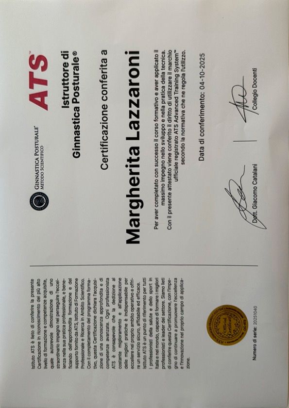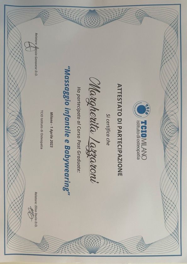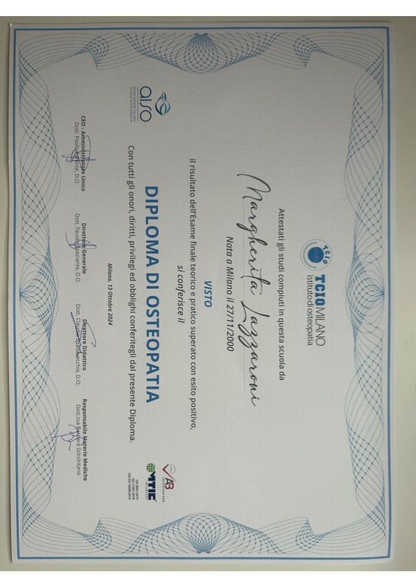 Sono Margherita Lazzaroni, osteopata diplomata presso il TCIO – Istituto di Osteopatia di Milano.