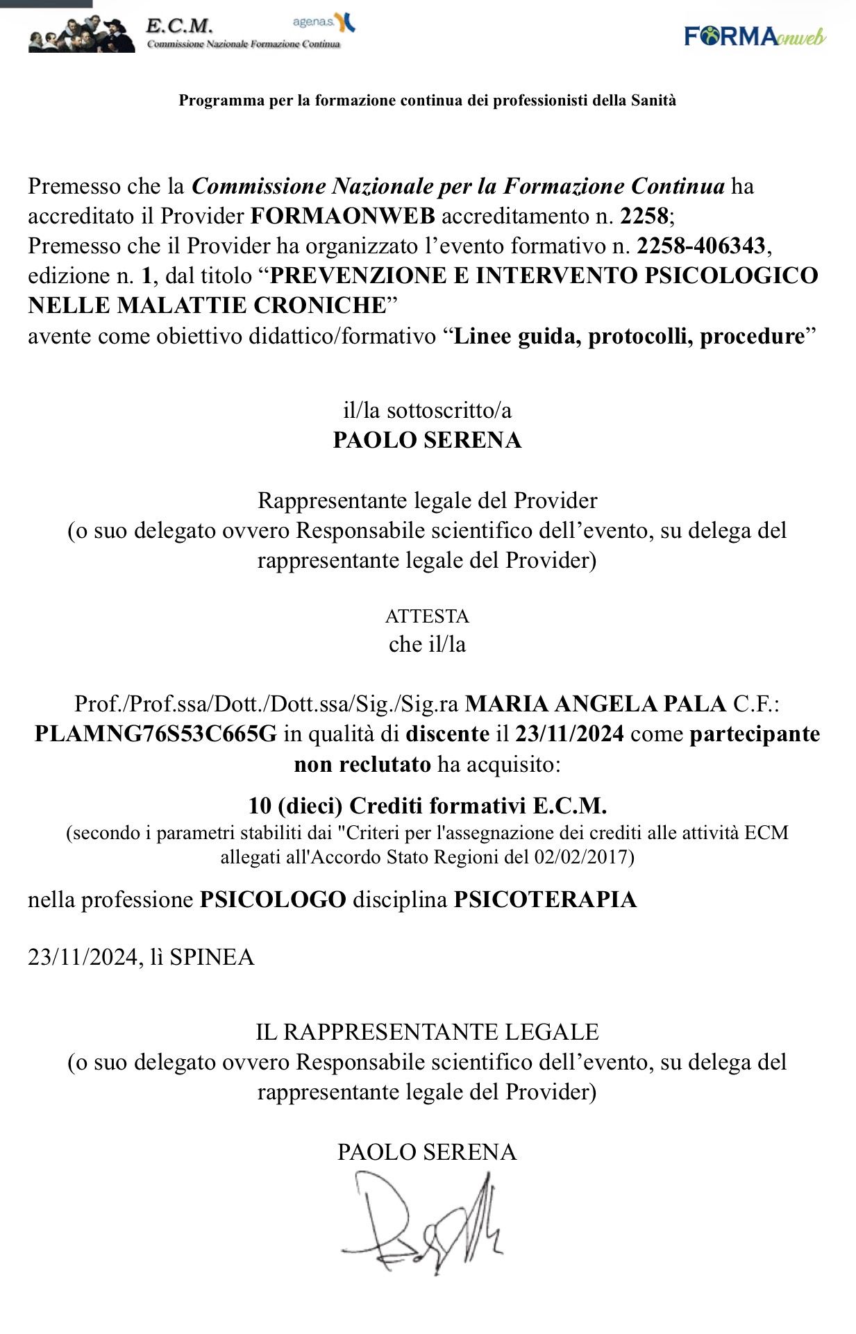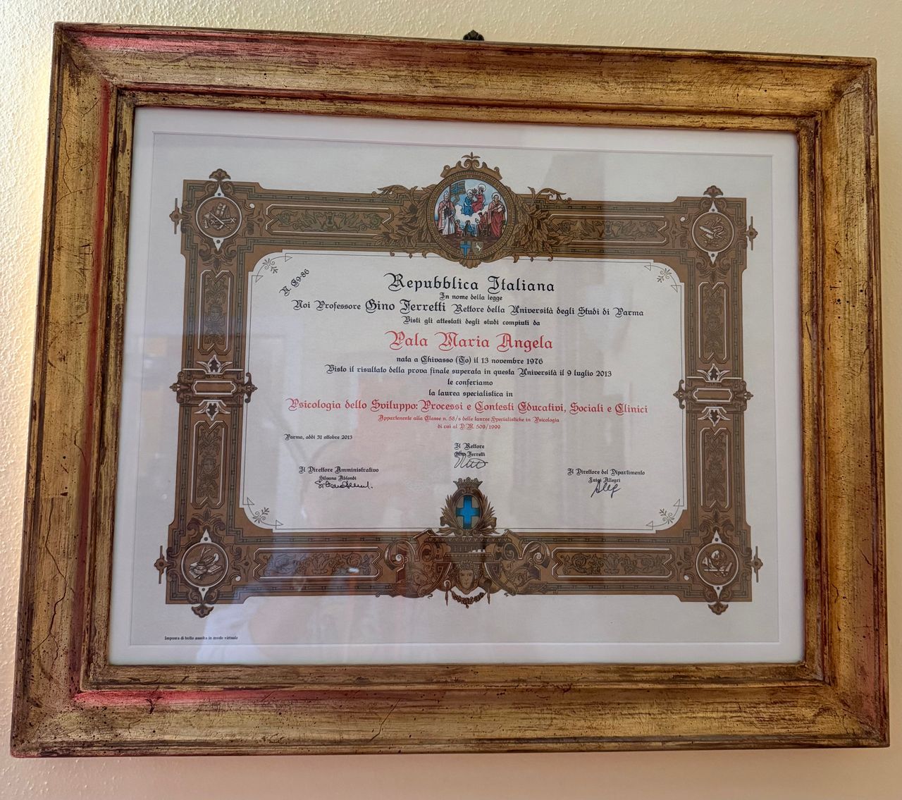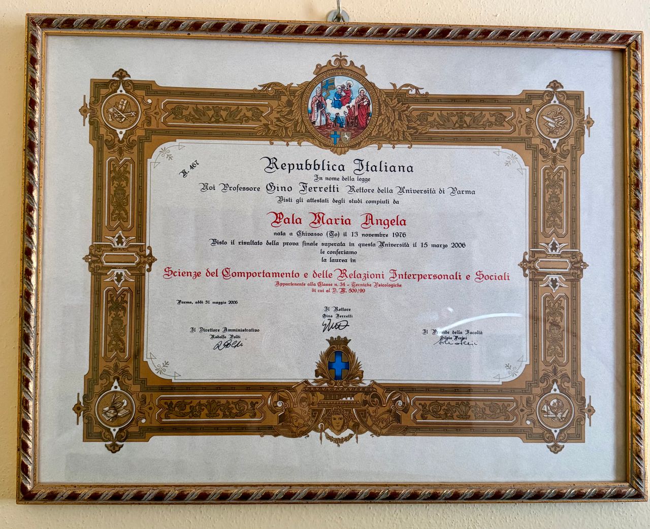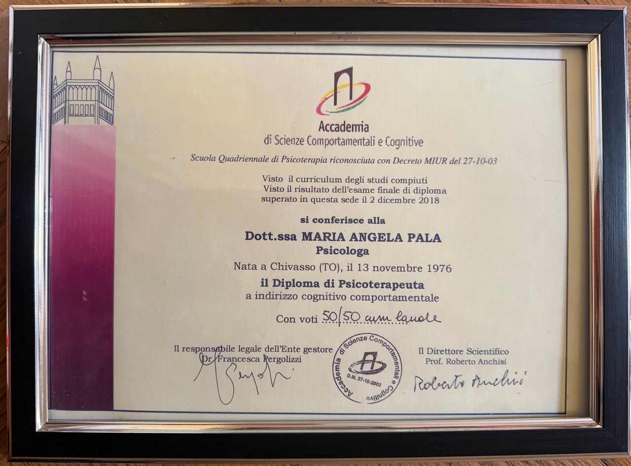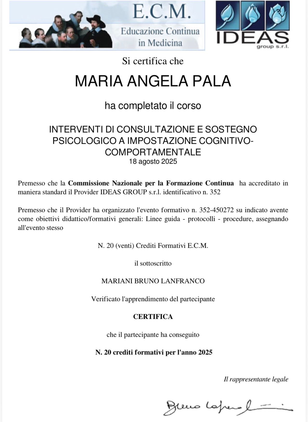 Sono la Dott.ssa Maria Angela Pala, Psicologa e Psicoterapeuta Cognitivo-Comportamentale a Parma, iscritta all’Albo degli Psicologi dell’Emilia-Romagna. Offro percorsi strutturati e personalizzati per ansia, attacchi di panico, stress, difficoltà universitarie e supporto psicologico in ambito oncologico.