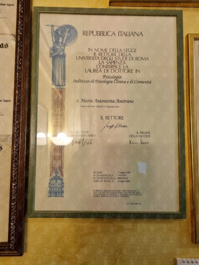 Nel 1997 mi sono laureata in Psicologia presso l'Università degli studi di Roma "La Sapienza" e nel 2002 ho completato la specializzazione in Psicoterapia Strutturale Integrata a Napoli.