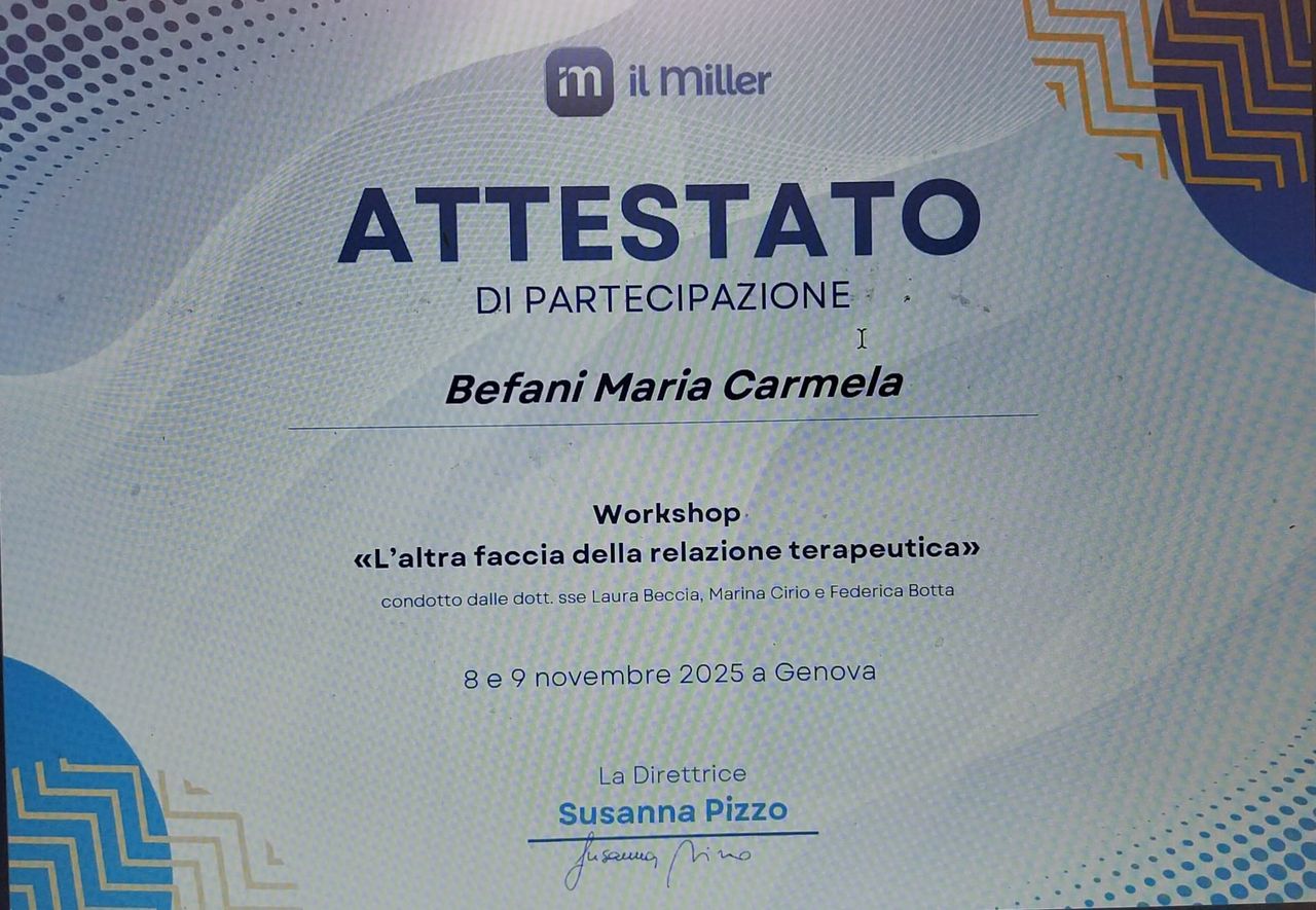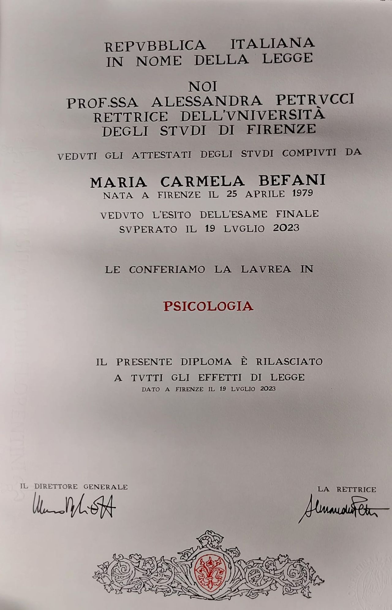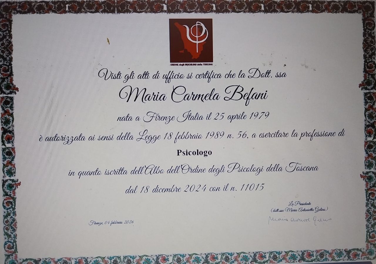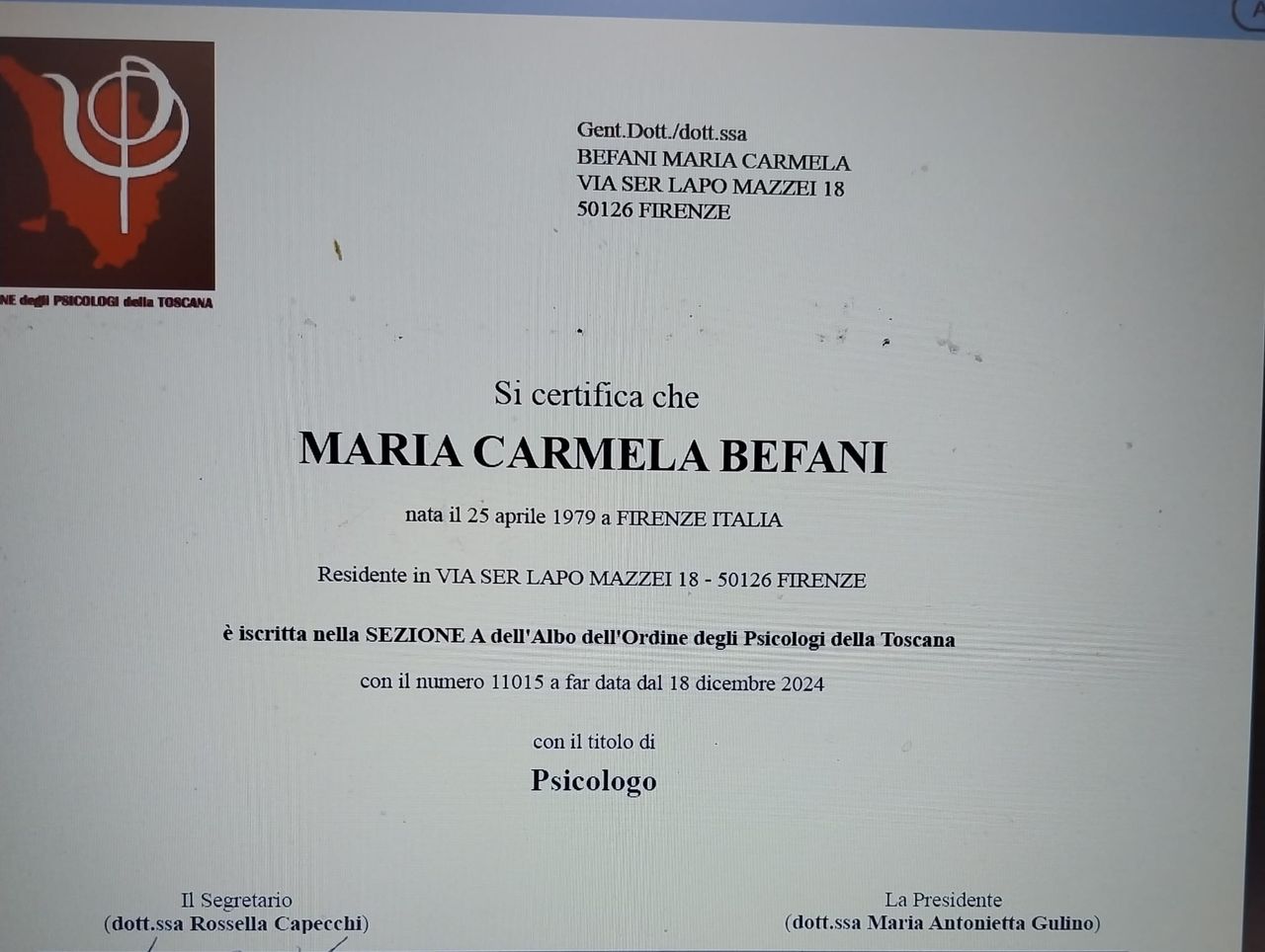 Grazie al suo accompagnamento mi sento più consapevole e fiduciosa. La consiglio sinceramente a chiunque cerchi una professionista empatica, competente e capace di mettere davvero al centro la persona.• Studio Privato Dott.ssa Maria Carmela Befani • colloquio psicologico •