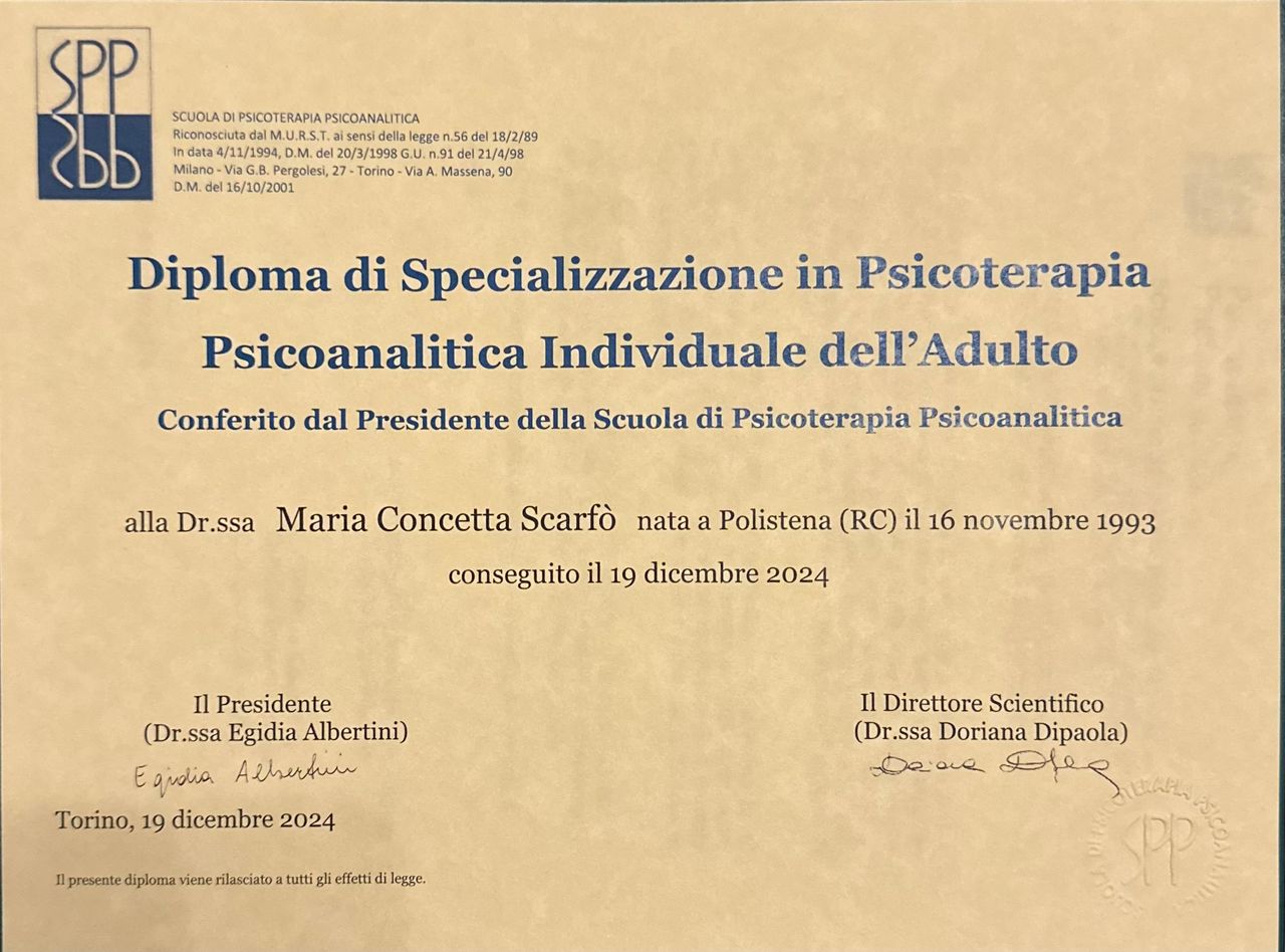 Sono la Dott.ssa Maria Concetta Scarfò, psicoterapeuta ad orientamento psicoanalitico, specializzata presso la SPP – Scuola di Psicoterapia Psicoanalitica di Torino. Mi occupo di percorsi di psicoterapia individuale per adolescenti, giovani adulti e adulti, sia in presenza che online.