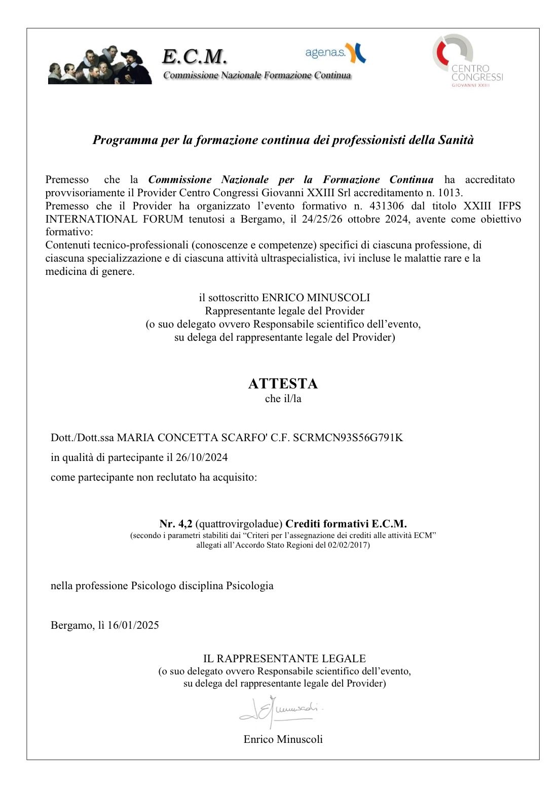 La dottoressa Scarfò si è dimostrata da subito gentile, empatica e attenta. Con lei mi sono sentita immediatamente accolta e capita, cosa per me fondamentale in un periodo particolarmente difficile della mia vita. Il suo modo di porsi mi ha permesso di aprirmi con serenità e sentirmi davvero sostenuta.