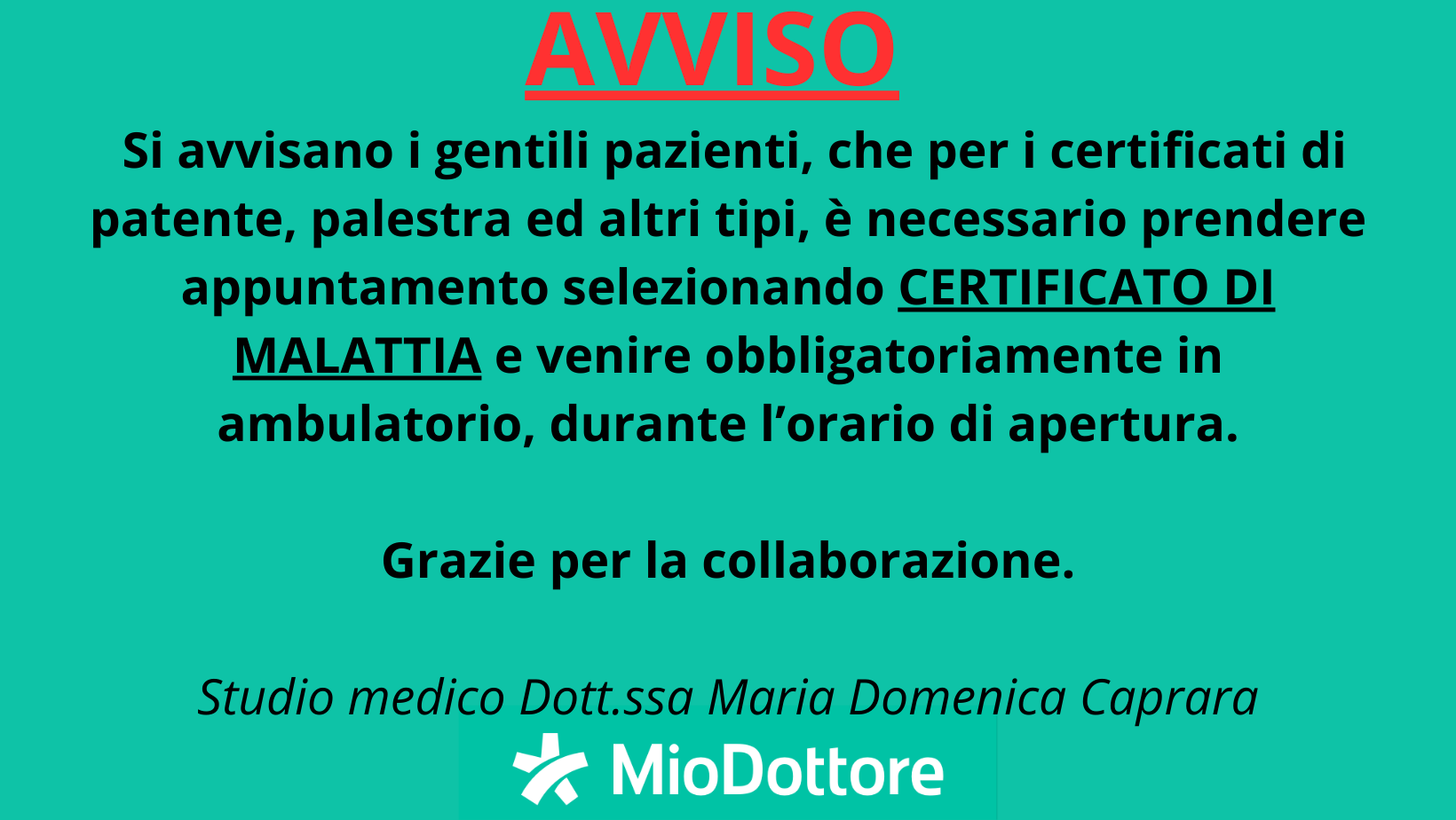 Si avvisano i gentili pazienti, che per i certificati di patente, palestra ed altri tipi, è necessario prendere appuntamento selezionando CERTIFICATO DI MALATTIA e venire obbligatoriamente in ambulatorio, durante l’orario di apertura.
