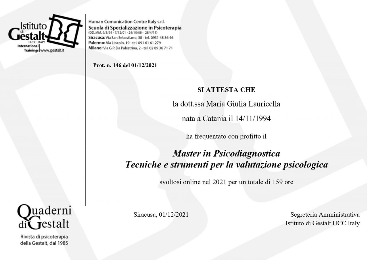 Sono la Dott.ssa Maria Giulia Lauricella, psicologa clinica e psicoterapeuta in formazione presso la Scuola di Psicoterapia della Gestalt. Ho svolto diversi periodi di formazione e tirocinio che mi hanno consentito di acquisire competenze specialistiche e di affinare una sensibilità professionale utile per lavorare con bambini, adolescenti e adulti.