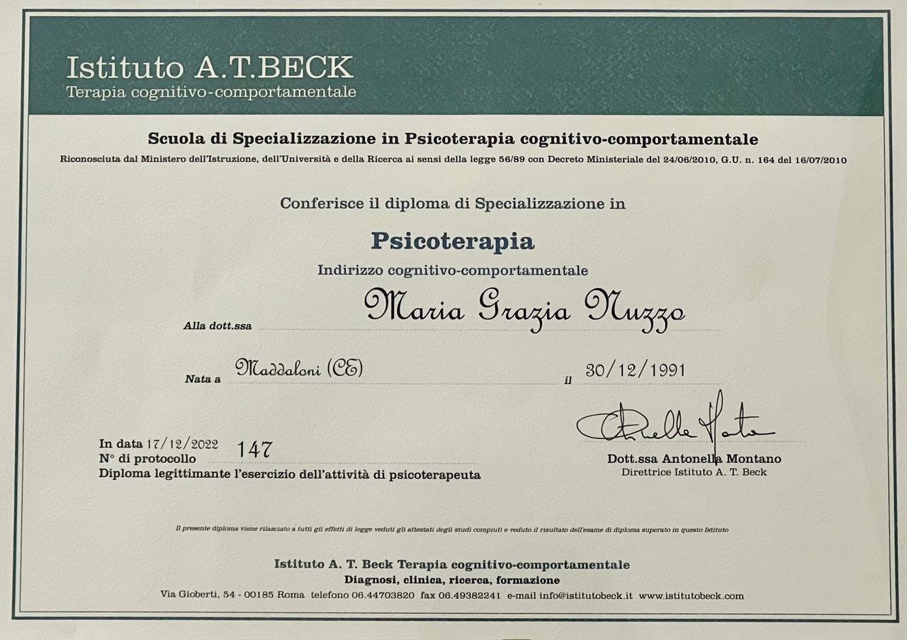 Sono la Dott.ssa Maria Grazia, Psicoterapeuta specializzata in approccio Cognitivo Comportamentale (CBT). Nel mio lavoro mi occupo di fornire strumenti pratici e strategie efficaci per affrontare momenti di crisi, ansia e sofferenza psicologica, aiutando la persona a ritrovare il proprio benessere nel "qui ed ora".