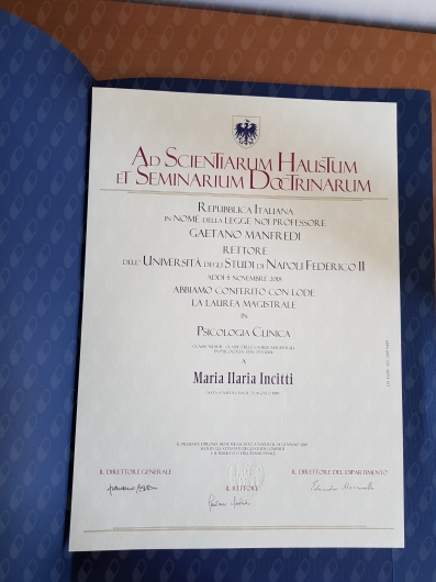 Questa è la mia storia formativa e professionale: mi sono laureata in Psicologia Clinica (curriculum: Psicologia dell'intervento clinico e di comunità) presso l'Università degli Studi di Napoli Federico II con votazione di 110/110 e Lode.