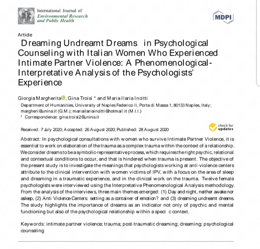 Nel 2020 sono stata co-autrice di una pubblicazione che è stata la naturale evoluzione del mio lavoro sperimentale di tesi di laurea. La pubblicazione in questione, avvenuta sull' International Journal of Environmental Research and Public Health, è relativa al lavoro con le donne che fanno fronte alle ferite della violenza. Ho svolto il tirocinio post-lauream della durata di un anno presso un Centro clinico di Psicoterapia, occupandomi di svariate forme di disagio psichico, e nell'ambito di diversi Centri AntiViolenza attivi sul territorio di Napoli in cui ho lavorato con donne con storie di violenza di genere, prevalentemente intrafamiliare.