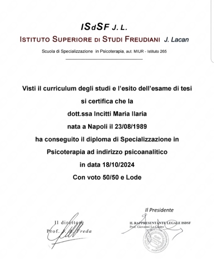Nel 2024 ho inoltre conseguito la Specializzazione Quadriennale in Psicoterapia ad orientamento psicoanalitico con votazione di 50/50 e Lode.