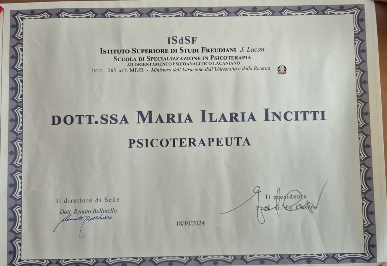 Nel 2024 ho inoltre conseguito la Specializzazione Quadriennale in Psicoterapia ad orientamento psicoanalitico con votazione di 50/50 e Lode.