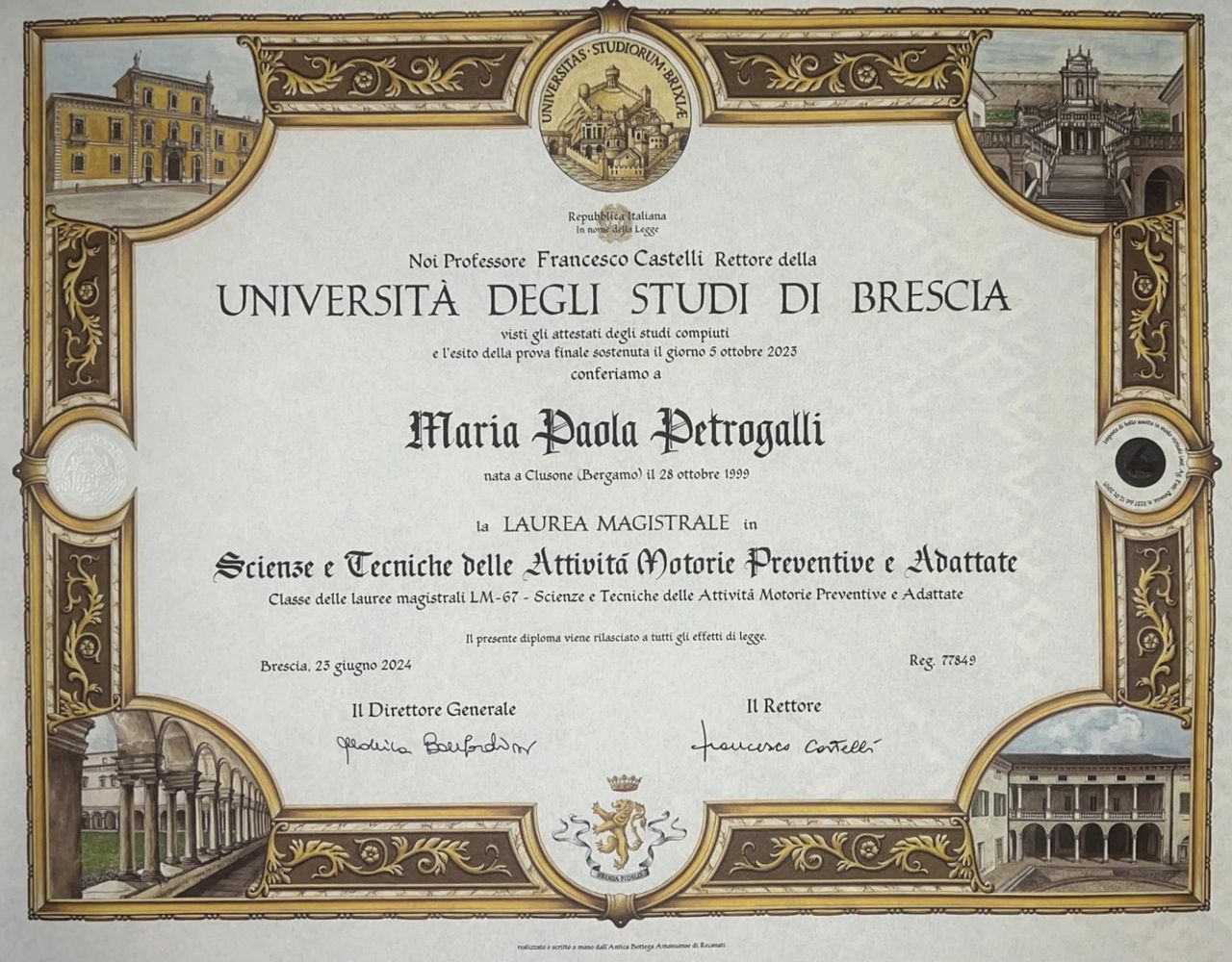 Sono laureata in Scienze Motorie e ho conseguito la Laurea Magistrale in Scienze e Tecniche delle Attività Motorie Preventive e Adattate, con un percorso formativo orientato alla salute, alla prevenzione e al benessere della persona.