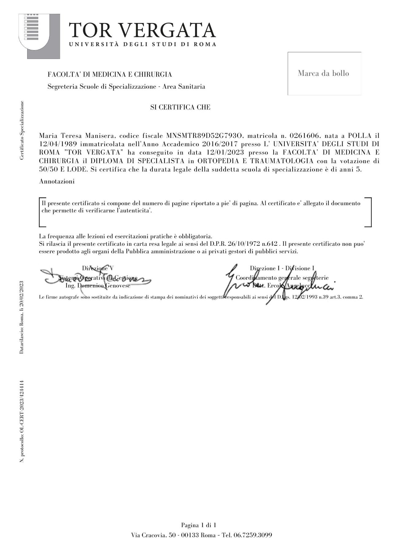 Nel corso della mia specializzazione, ho dimostrato particolare interesse per la traumatologia sportiva e la chirurgia della spalla, seguendo numerosi corsi e congressi.