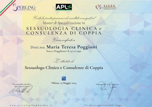 Laureata in Psicologia dello Sviluppo e dei Processi di Tutela presso l'Università Cattolica del Sacro Cuore, sono iscritta all’Ordine degli Psicologi della Lombardia. Ho conseguito il Master di Specializzazione in Sessuologia Clinica e Consulenza di Coppia, e sono iscritta all'Albo SISES (Società Italiana di Sessuologia ed Educazione Sessuale). Sto ultimando la mia formazione come psicoterapeuta presso la Scuola di Psicoterapia "Mara Selvini Palazzoli" di Milano, a orientamento sistemico-familiare.