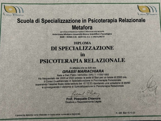 Sono specializzata, grazie all’esperienze lavorative e formative, nella gestione dei comportamenti a rischio, gestione delle crisi di coppia e relazionali, sostegno alla genitorialità,