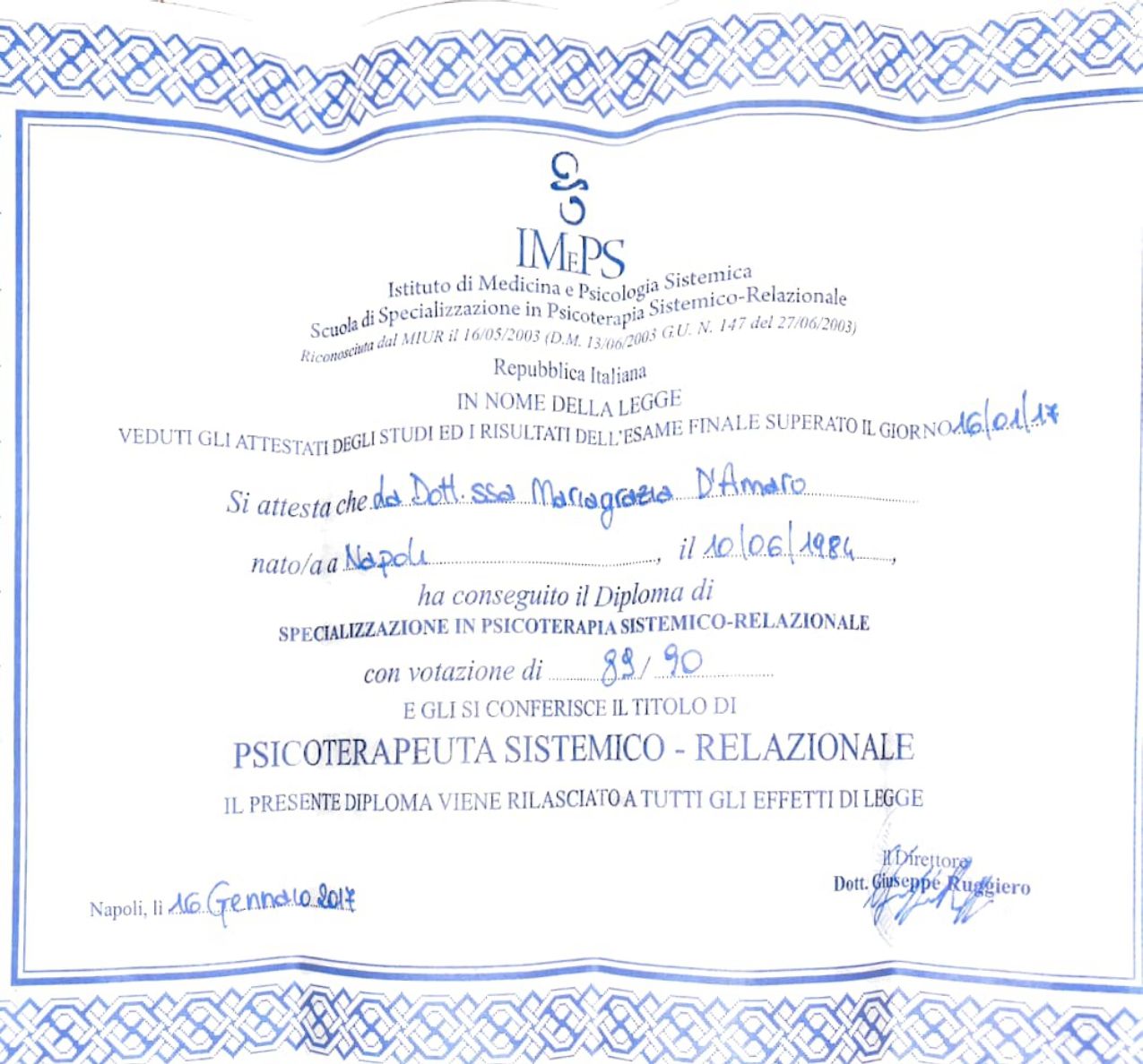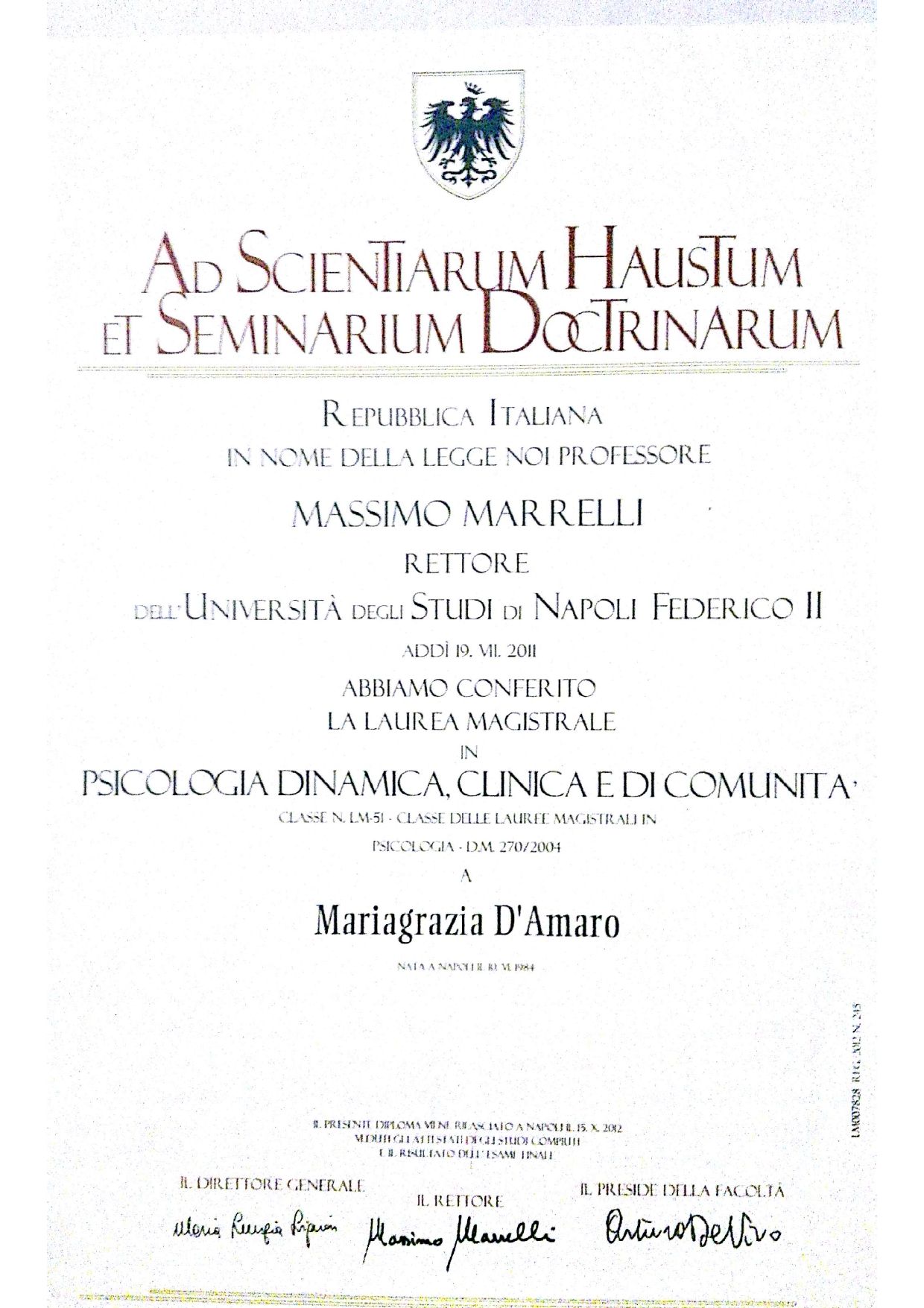 Mi chiamo Mariagrazia D’Amaro sono nata e cresciuta in provincia di Salerno e svolgo con piacere la professione di psicologo- psicoterapeuta.